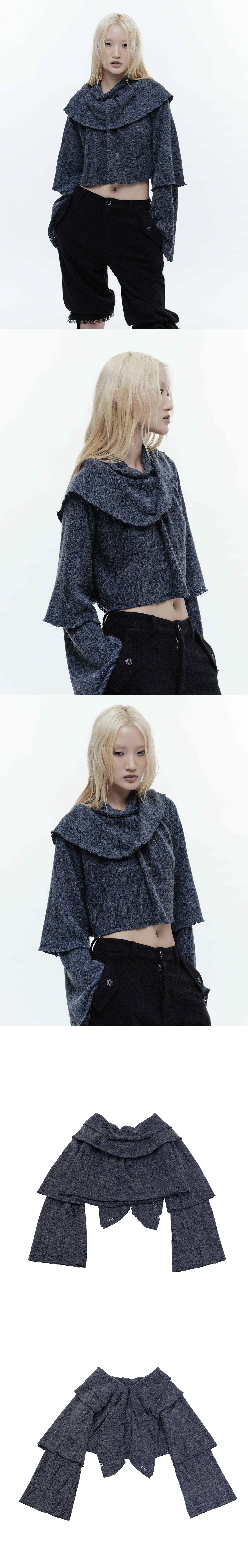 ACRYLIC 80% NYLON 20% 총장 36.5cm, 가슴 55cm, 소매 69cm, 밑단 63cm * 상세 사이즈는 단면 기준이며, 측정 방법과 위치에 따라 1~3cm 오차 범위가 생길 수 있습니다. * 모델(174cm) 피팅 사이즈 / OS 레이어드 넥, 슬리브 디자인 다양하게 연출 가능한 더블 넥 디테일 플레어 소매 로우 엣지 마감 데미지 디테일 플레어 슬리브 디자인 루즈핏