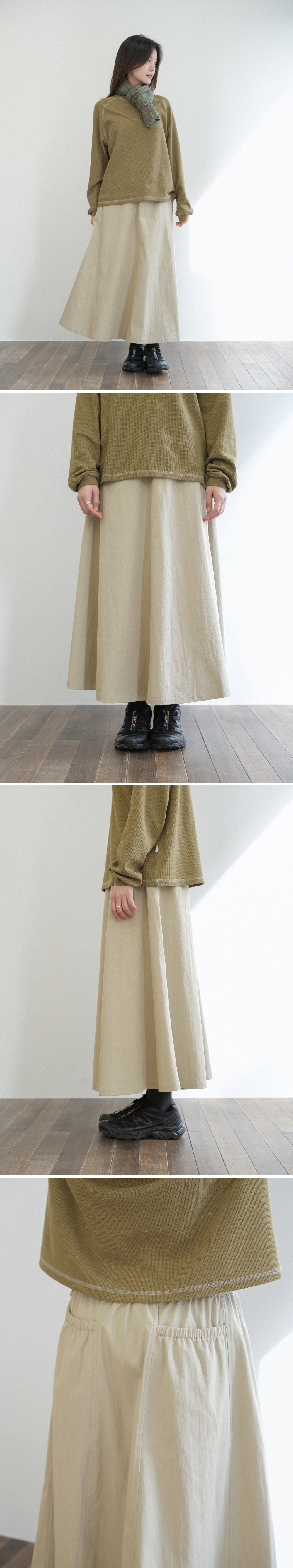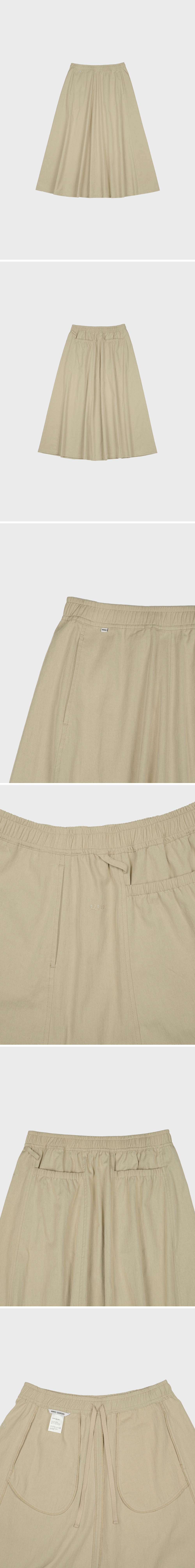 - 가볍고 탄탄한 면‧나일론 혼방 원단으로 제작 - 전면에서 깔끔하게 떨어지는 A라인 실루엣 - 에메모만의 패턴으로 완성된 볼륨감 있는 후면 밴딩 포켓 디자인 - 허리 안쪽 끈으로 사이즈 조절이 가능한 밴딩 스커트 - 허리 벨트 라인에 가벼운 소지품을 걸 수 있는 고리 티테일 - 전면 벨트 아래 피스 라벨과 왼쪽 톤온톤 자수로 더한 은은한 디테일 색상 베이지 소재 면 75%, 나일론 25% 사이즈 (cm) 총장 84 / 허리 35 / 엉덩이 55.5 / 밑단폭 108.5