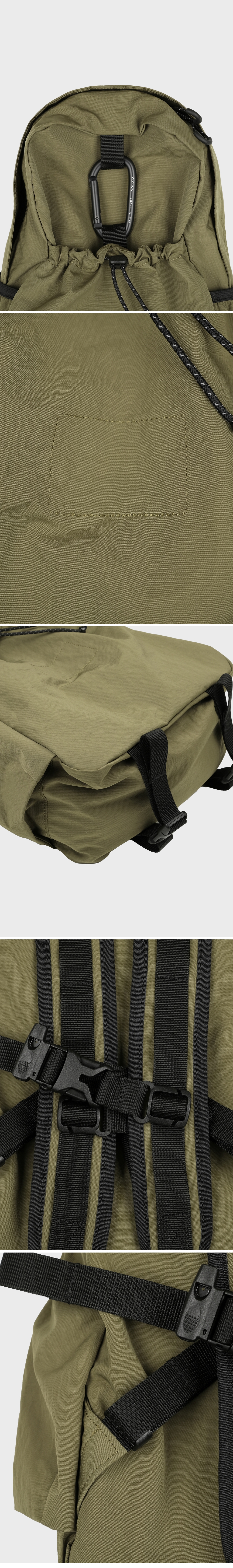 - 리사이클 나일론 70D 원단 - 부드러운 터치감과 나일론 특유의 바스락거림 - 사선 무늬의 텍스처와 은은한 광택감 - 트윌 조직 특유의 밀도 높은 짜임으로 얇지만 뛰어난 내구성 - 발수 가공 처리로 가벼운 생활 방수 가능 - 내부 태블릿 포켓과 메쉬 원단의 투 포켓 구성 - 외부 양 사이드포켓과 전면 스트링 포켓 구성 - 085 > 맥북 13인치 수납 가능 탈부착 가능한 가슴 스트랩에는 위급한 상황에서 사용할 수 있는 휘슬이 부착되어 있습니다. 에메모가든 로고가 각인된 카라비너에는 모자나 소품을 걸어 포인트를 줄 수 있습니다. 전면 스트링 포켓으로 가방을 뒤집어 넣어 패커블 형태로 보관할 수 있습니다. (패커블 시에만 보이는 메인 라벨은 겉면에서 스티치만 보입니다.) let's walk slowly. 색상 Olive (노란빛이 도는 카키 컬러로, 농익은 올리브의 오묘한 색감)