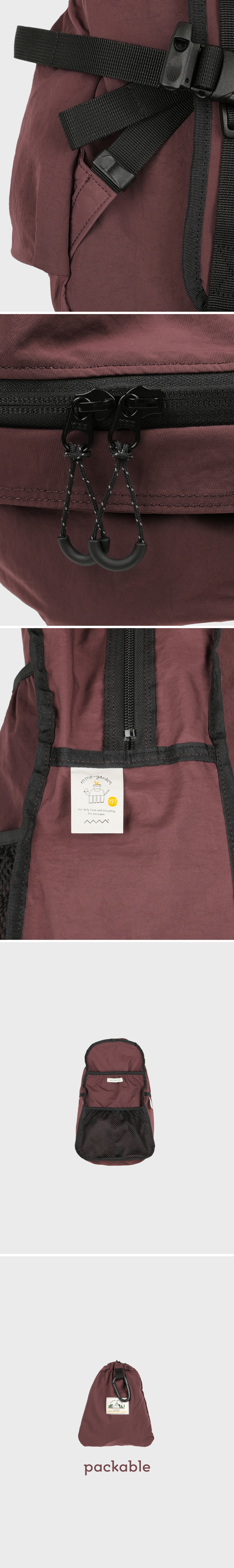 - 리사이클 나일론 70D 원단 - 부드러운 터치감과 나일론 특유의 바스락거림 - 사선 무늬의 텍스처와 은은한 광택감 - 트윌 조직 특유의 밀도 높은 짜임으로 얇지만 뛰어난 내구성 - 발수 가공 처리로 가벼운 생활 방수 가능 - 내부 태블릿 포켓과 메쉬 원단의 투 포켓 구성 - 외부 양 사이드포켓과 전면 스트링 포켓 구성 - 075 > 아이패드 11인치 수납 가능 탈부착 가능한 가슴 스트랩에는 위급한 상황에서 사용할 수 있는 휘슬이 부착되어 있습니다. 에메모가든 로고가 각인된 카라비너에는 모자나 소품을 걸어 포인트를 줄 수 있습니다. 전면 스트링 포켓으로 가방을 뒤집어 넣어 패커블 형태로 보관할 수 있습니다. (패커블 시에만 보이는 메인 라벨은 겉면에서 스티치만 보입니다.) let's walk slowly. 색상 Burgundy (짙은 와인빛의 붉은 컬러에 은은하게 브라운도 느껴지는 오묘한 색감)