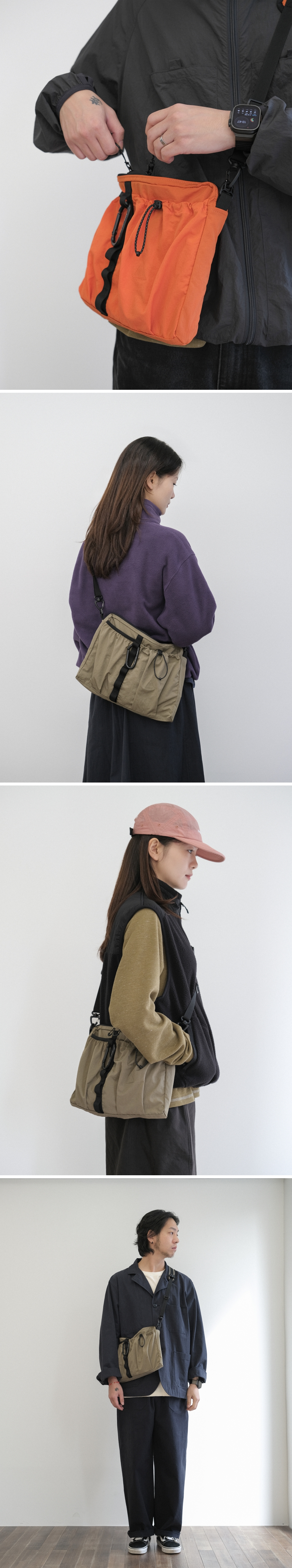 - 리사이클 나일론 70D 원단 - 부드러운 터치감과 나일론 특유의 바스락거림 - 사선 무늬의 텍스처와 은은한 광택감 - 트윌 조직 특유의 밀도 높은 짜임으로 얇지만 뛰어난 내구성 - 발수 가공 처리로 가벼운 생활 방수 가능 - 외부 텀블러와 여러 소품들을 담을 수 있는 스트링 포켓과 후면 지퍼 포켓 - 내부 메쉬 원단 투 포켓 오랜 시간 메고 돌아다녀도 편하도록 에어메쉬로 어깨끈을 제작하였으며, 위험한 상황 발생 시 사용 가능한 호루라기가 달려있습니다. (메는 방향에 따라 탈 부착 가능) 에메모가든 로고가 각인된 카라비너에는 모자나 소품을 걸어 포인트를 줄 수 있습니다. 전면 스트링 포켓으로 가방을 뒤집어 넣어 패커블 형태로 보관할 수 있습니다. (패커블 시에만 보이는 메인 라벨은 겉면에서 스티치만 보입니다.) let's walk slowly. 색상 Mud Khaki (베이지, 카키, 옐로우 등의 색감이 섞여 오묘한 머드 색감)
