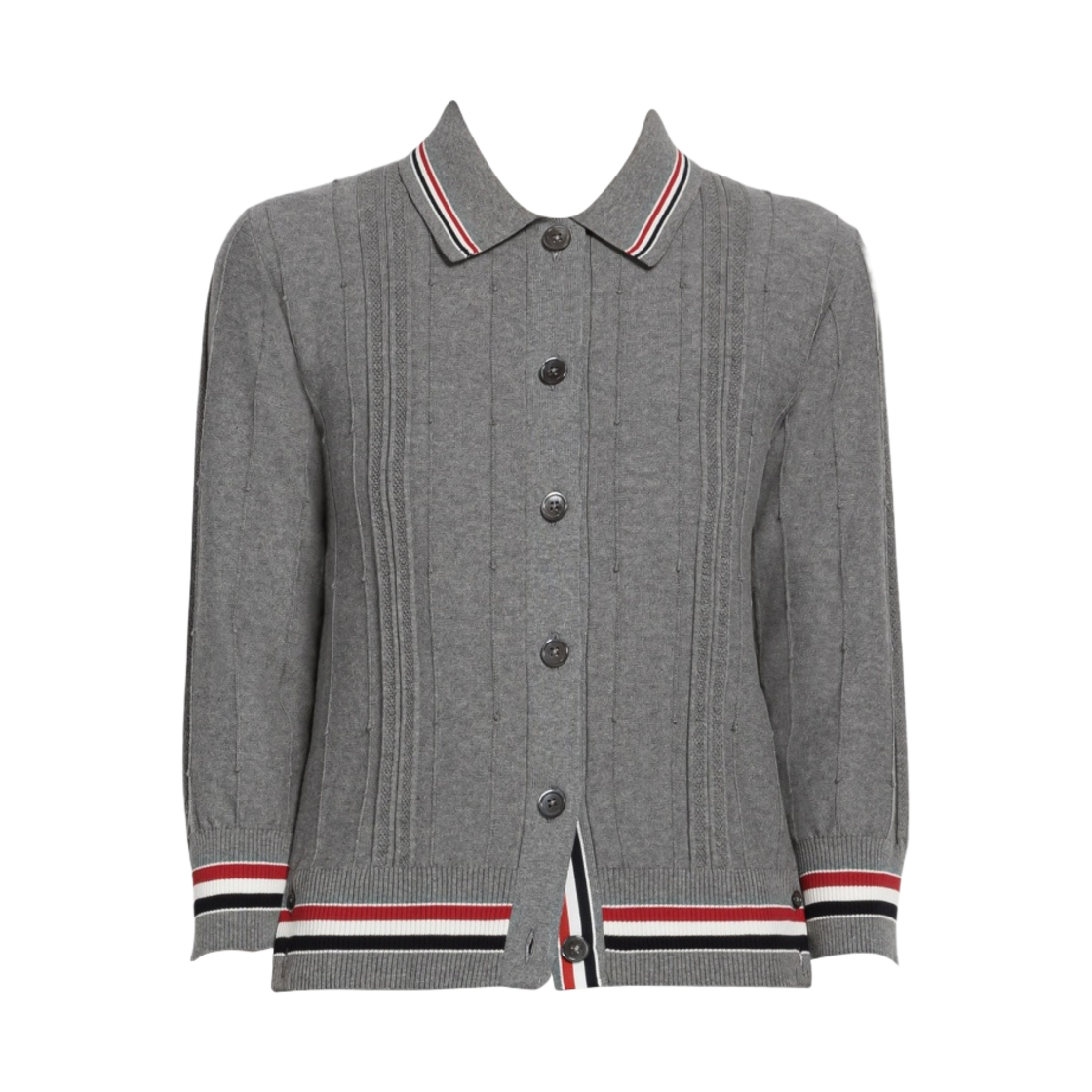 (W) Thom Browne High Twist Cotton Cricket Stripe Polo Cardigan Light Grey