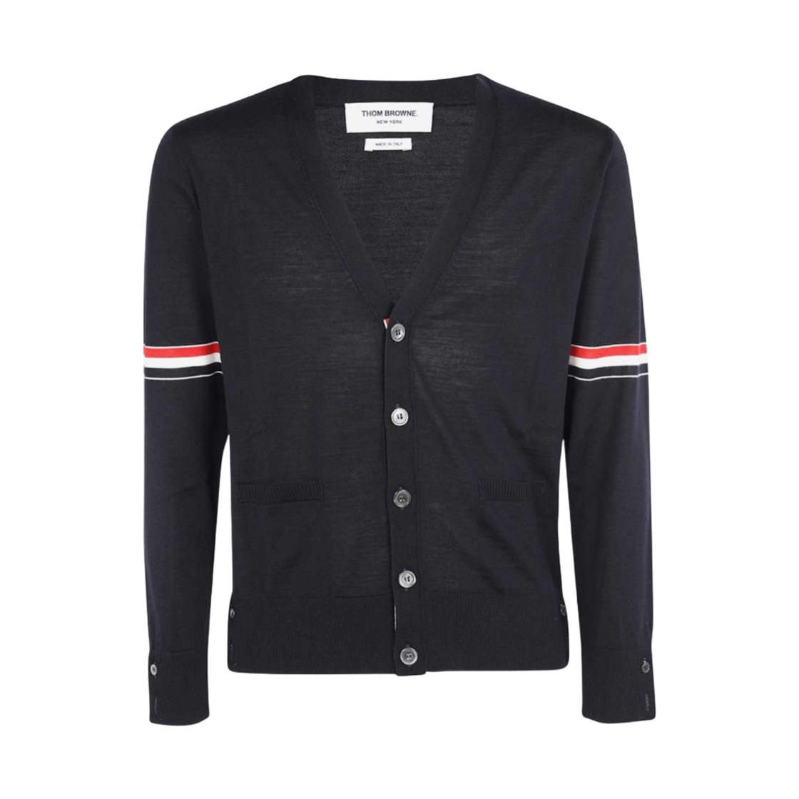 톰브라운 파인 메리노 울 스트라이프 브이넥 가디건 네이비