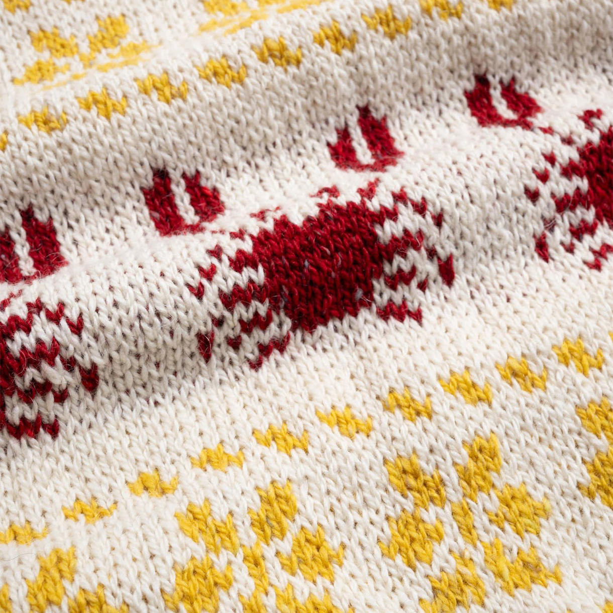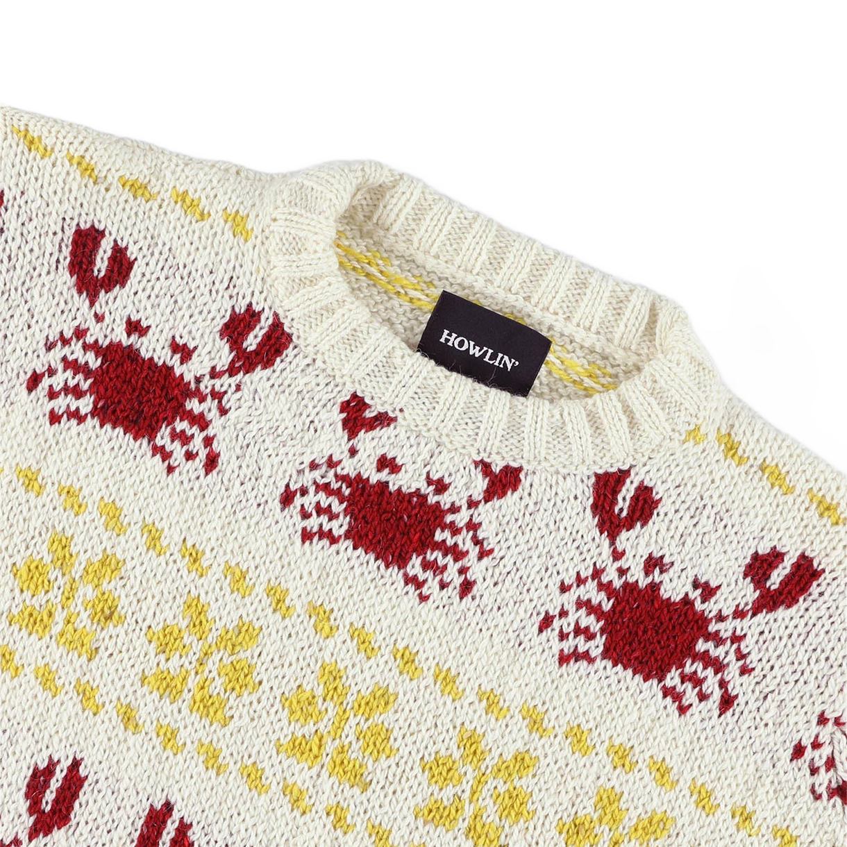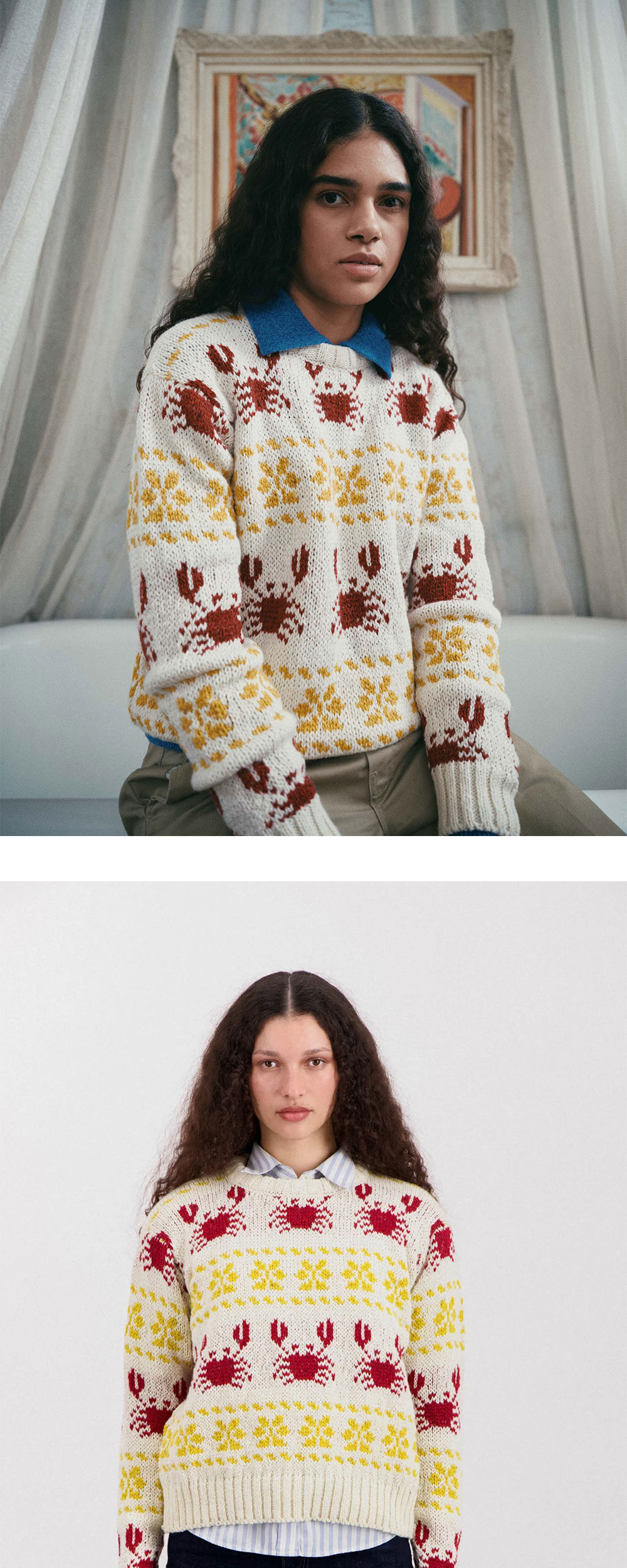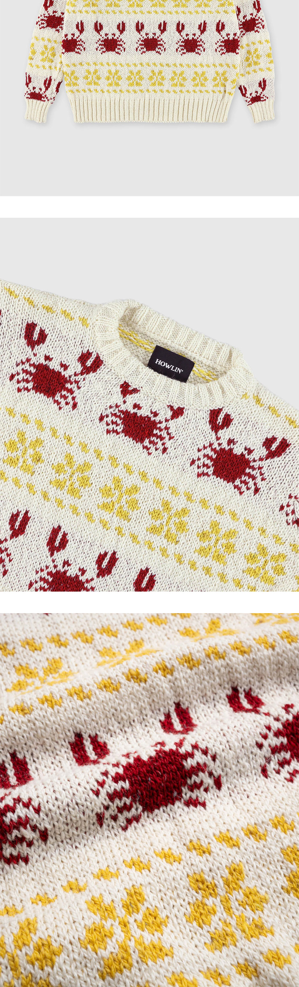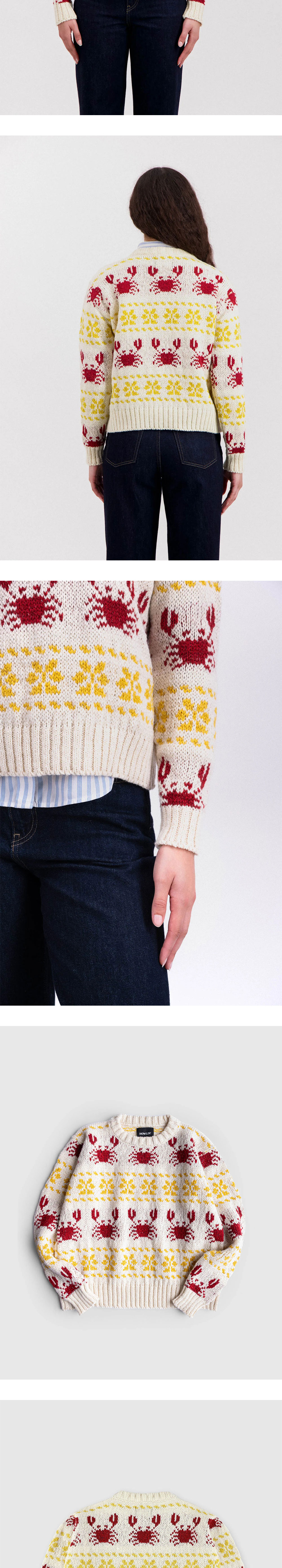 하울린 우먼 크랩스 인 스페이스 에크루입니다. - 아일랜드에서 뜨개질한 크루넥 점퍼 - 게와 기하학적 모티브가 반복되는 패턴 - 프리미엄 모헤어와 울 혼방 소재로 제작