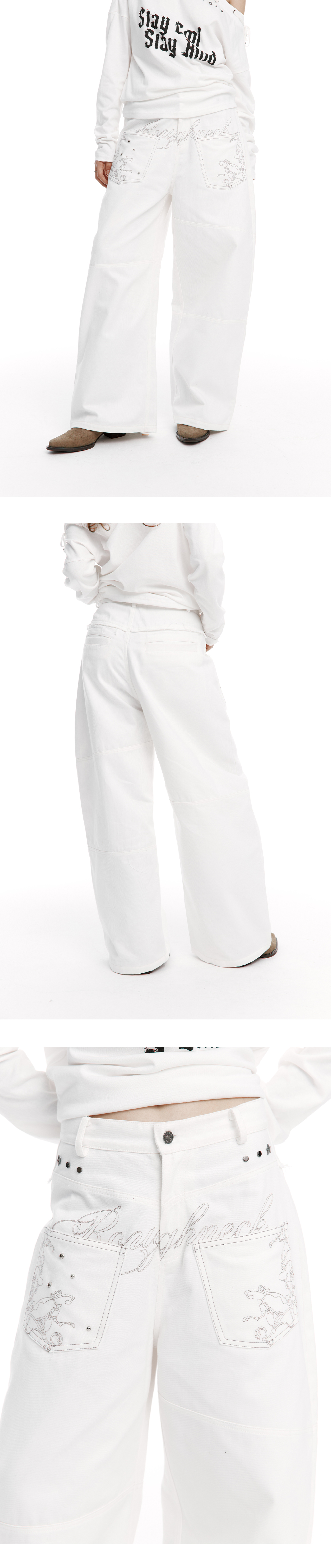 앞뒤가 반전된 듯한 유니크한 디자인으로, 앞면에 자리한 백포켓 자수와 실버 스터드 장식이 포인트를 더합니다. 곡선형 커브드 패턴으로 제작되어 자연스럽게 허리를 잡아주며, 슬림한 허리 라인을 연출합니다. 탄탄한 면 소재와 와이드한 핏으로 편안한 착용감과 스타일리시한 실루엣을 동시에 제공합니다. Model : 167cm 47kg / S Size 착용