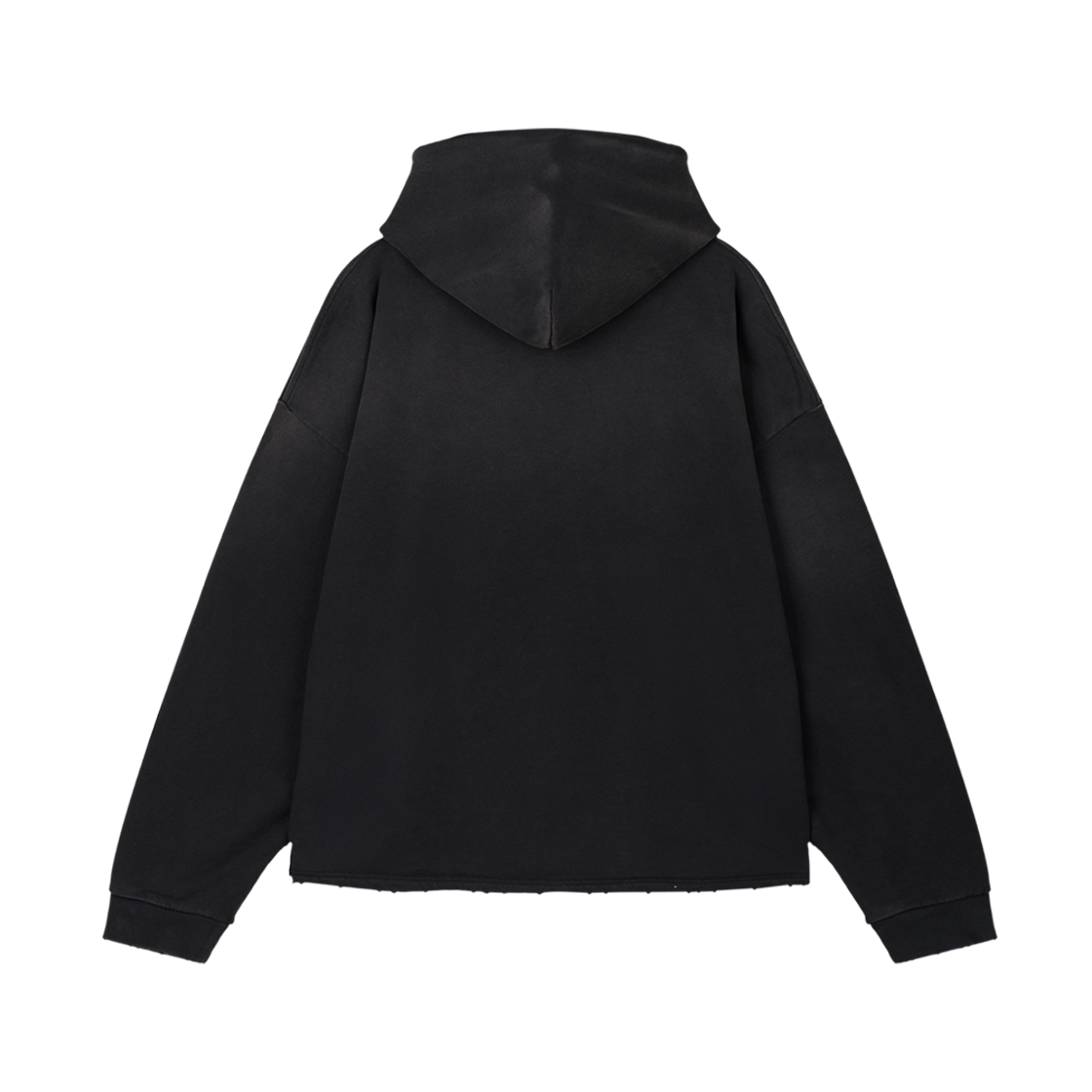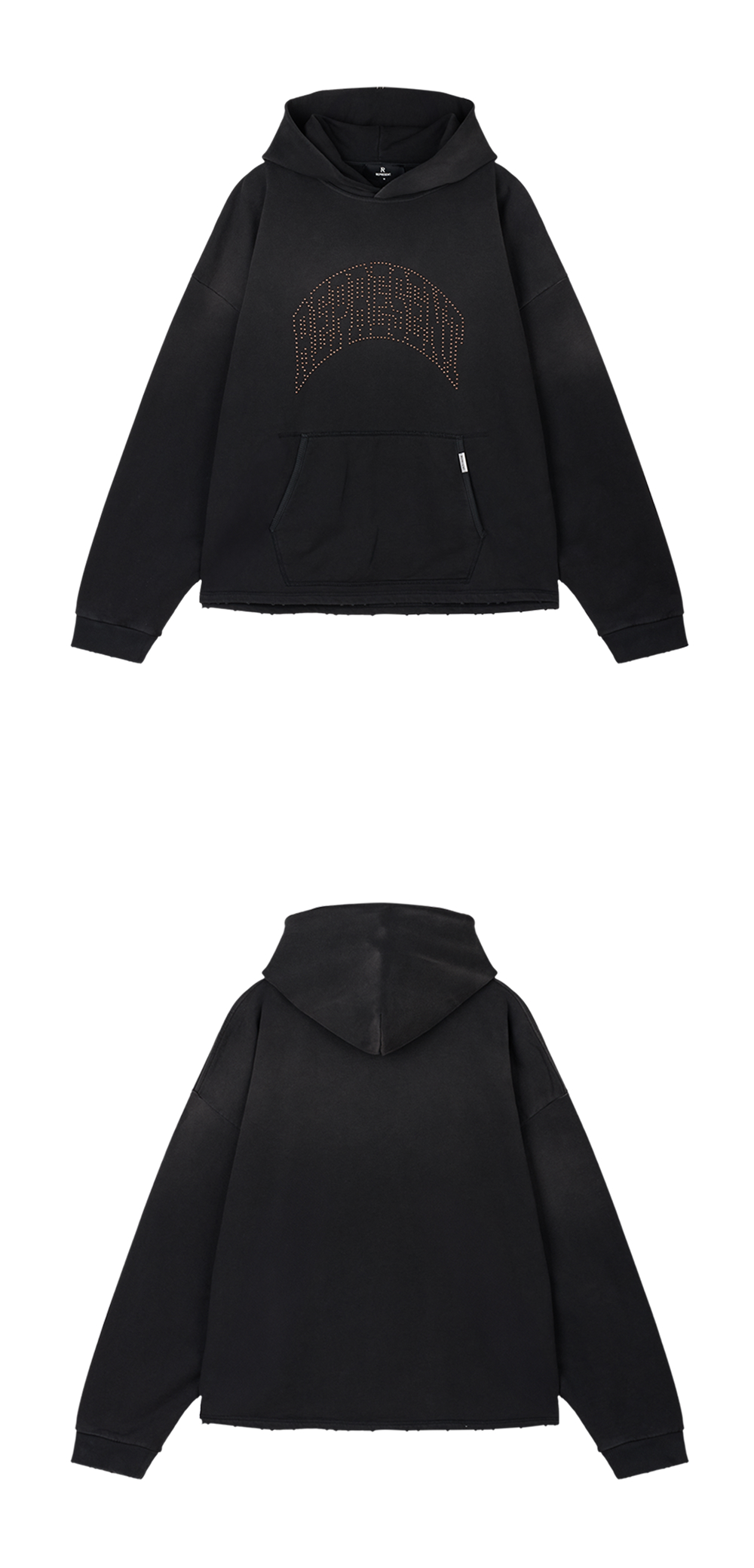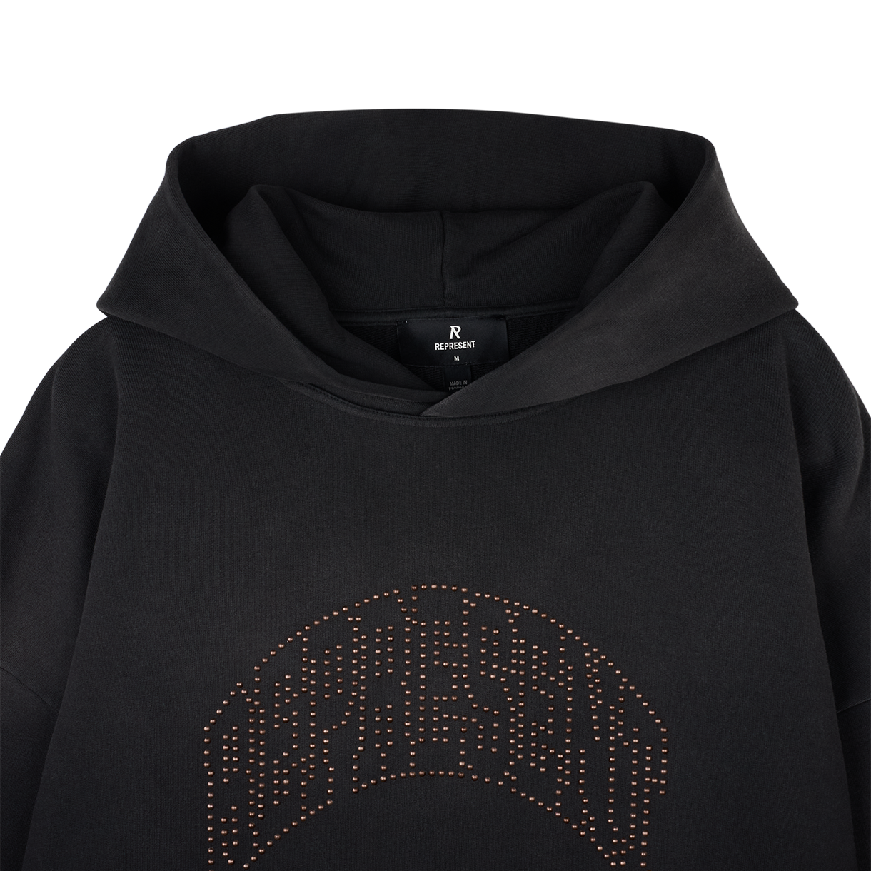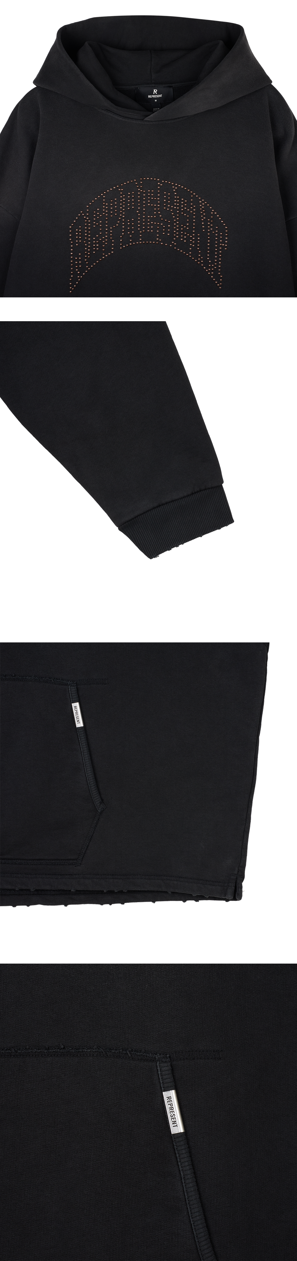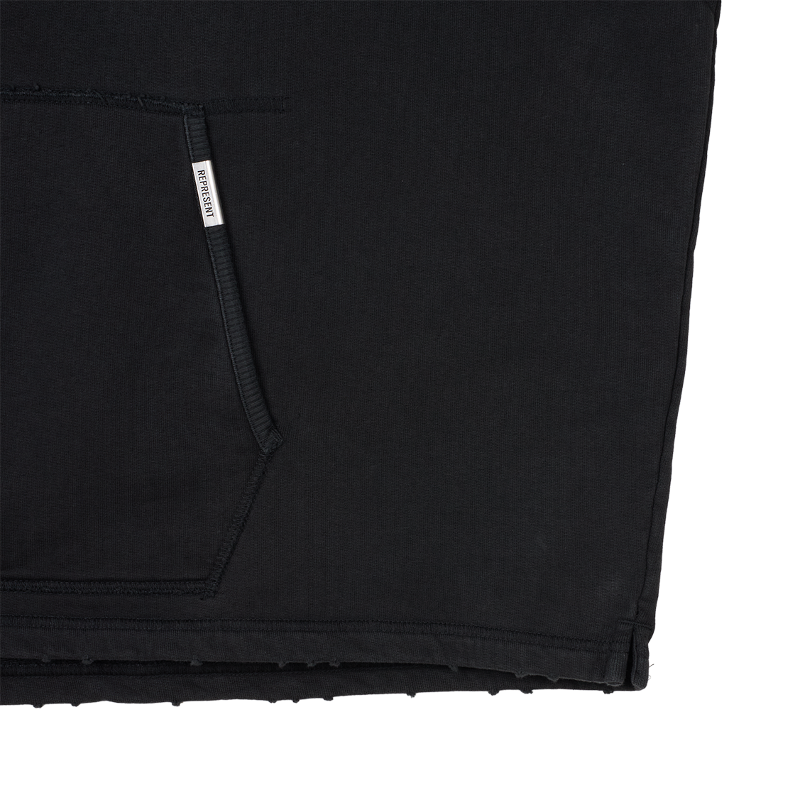 리프레젠트 엠벨리시드 후디 스테인드 블랙입니다. - 오버사이즈 드롭숄더 핏 - 빈티지 워싱 블랙 - 아치형 로고 디자인 - 밑단 디스트로이드 로우 컷팅 - 포켓 측면 메탈 브랜드 로고