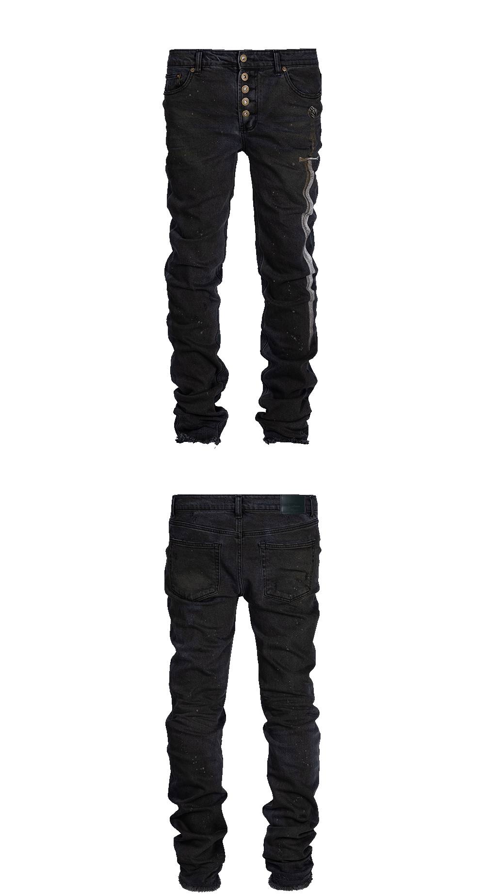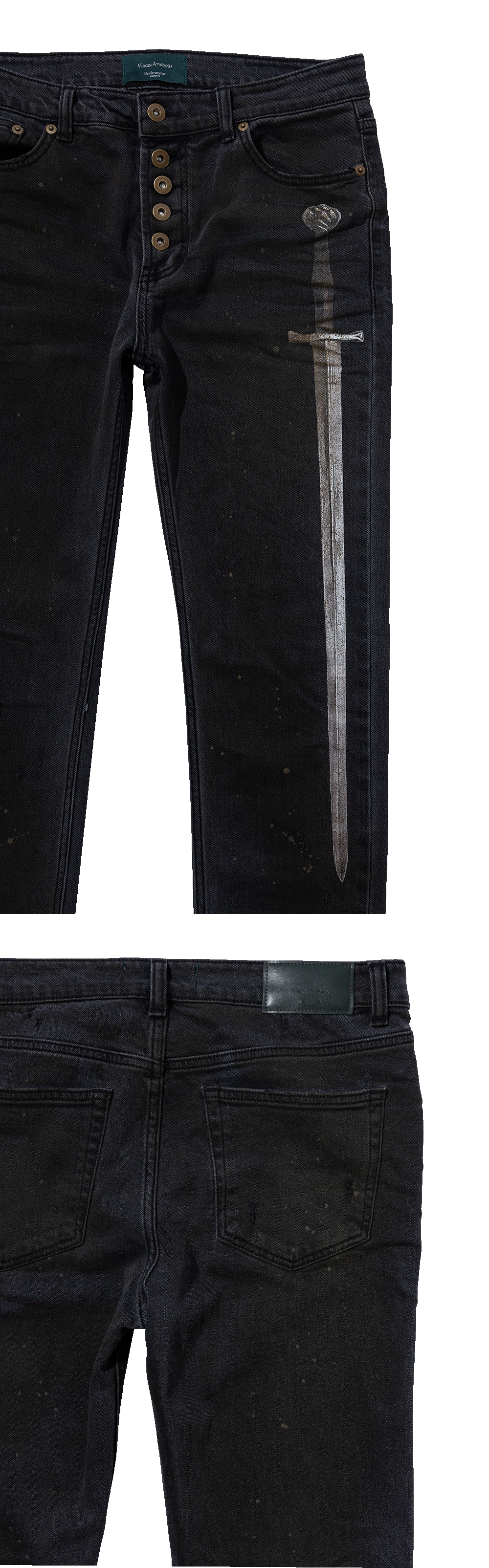 ✧ AI로 제작된 콘텐츠가 포함되었습니다 실제 블레이드 크기의 아트워크를 바지 전면부에 프린팅한 위트 있는 데님입니다. 페인트 후가공으로 빈티지함을 더했습니다.