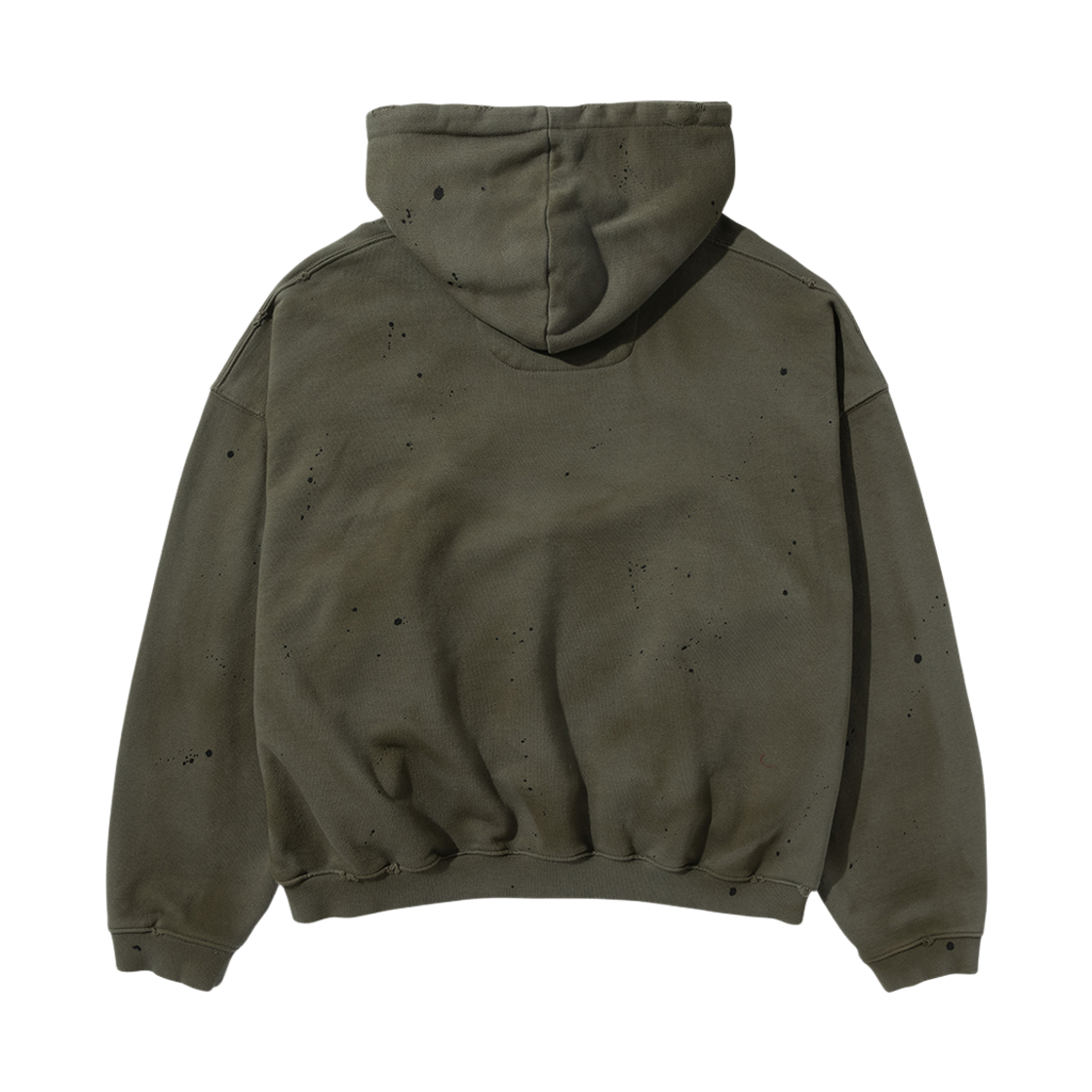 체커보드 프린팅의 올리브 후드티셔츠로, 더티 워싱과 찢어진 효과로 빈티지함을 더했습니다.