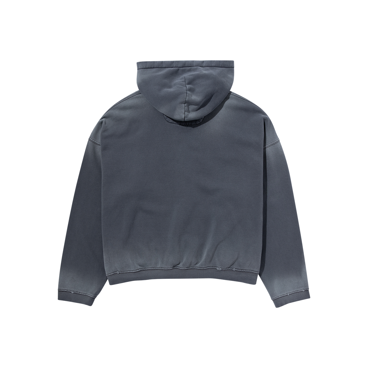 지워진 듯한 흐린 아트워크와 불규칙한 패치워크가 특징인 후드티셔츠