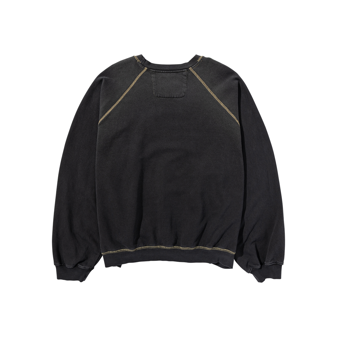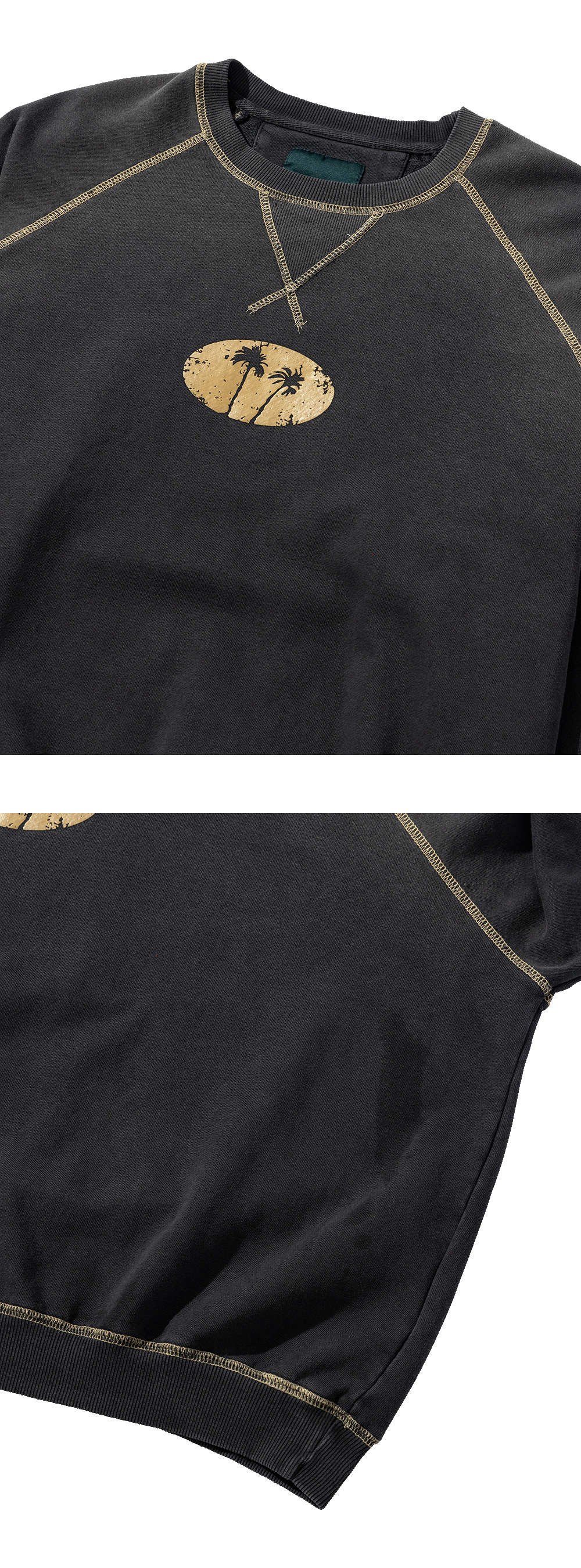 배트맨 로고를 연상시키는 노란색의 앰블럼에 노을 진 야자수 아트워크의 크루넥입니다. 노출된 노란색 스티치가 특징입니다.
