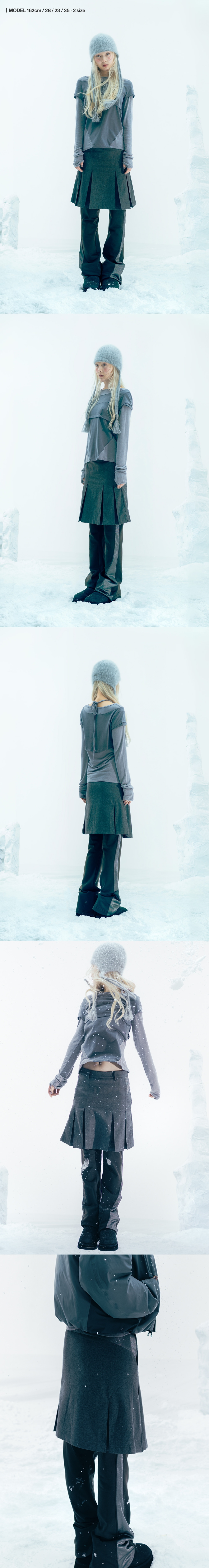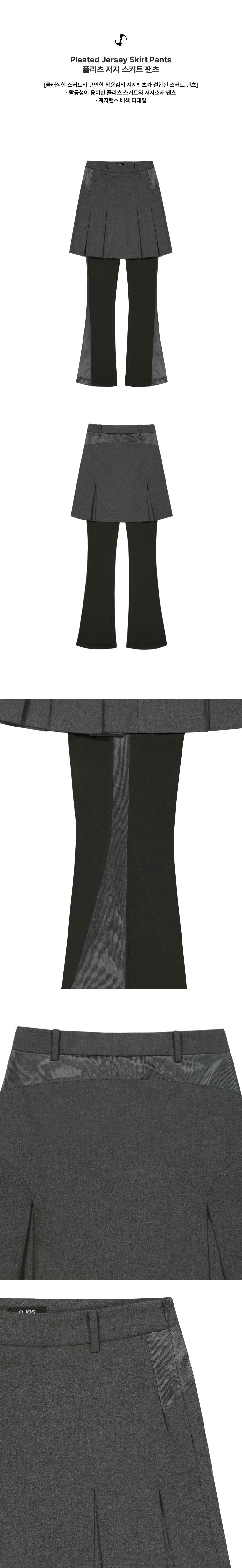 클래식한 스커트와 편안한 착용감의 져지팬츠가 결합된 스커트 팬츠 | 미디기장의 스커트와 부츠컷 팬츠 | 후면 OJOS 로고 자수 | 활동성이 용이한 플리츠 스커트와 져지소재 팬츠 | 사이드 포켓 | 져지팬츠 배색 디테일 | 사이드 YKK CONCEAL® 지퍼 마감상세설명 참조