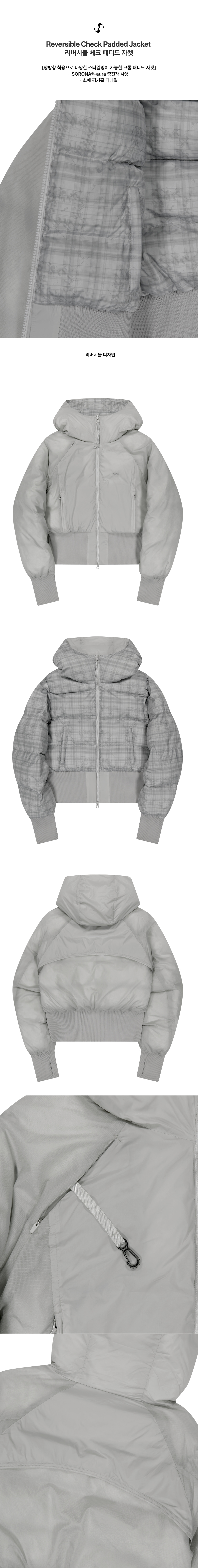 양방향 착용으로 다양한 스타일링이 가능한 크롭 패디드 자켓 | 크롭 핏 | 가벼움과 보온성에 탁월한 친환경 충전재 SORONA®-aura 사용 | 소매 핑거홀 디테일 | 전면에 YKK 1-way 양면지퍼 마감 A면 | 전면 OJOS 로고 자수 | 가슴 포켓 YKK CONCEAL® 지퍼 마감 B면 | OJOS 패턴 디테일 | 퀼팅라인 마감상세설명 참조