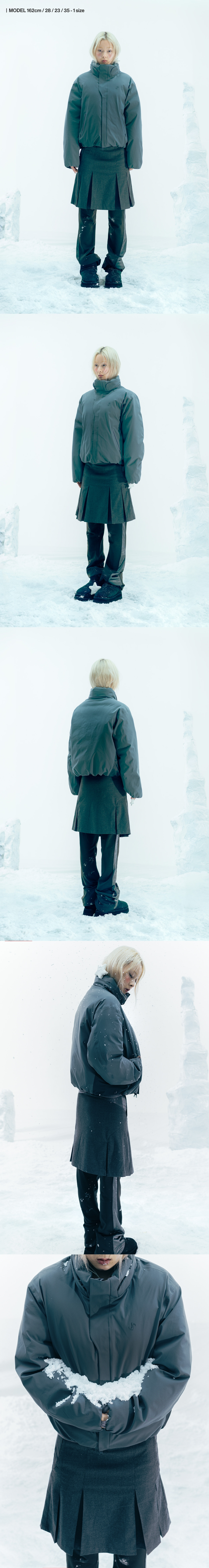 후드와 머플러가 분리되는 다운 자켓 | 오버핏 | 전면 심볼 로고 전사 | 소매 시즌 넘버 전사 | 발수소재와 심실링 마감 디테일 | RDS 인증 친환경 덕다운 사용 | 커브라인의 버튼 여밈 디테일 | 밑단과 소매 퍼프 마감 | 소매 핑거홀 디테일 | 후드와 머플러 지퍼와 스냅을 통해 탈부착 가능 | 전면에 2-way 방수지퍼 및 OJOS 풀러 마감상세설명 참조