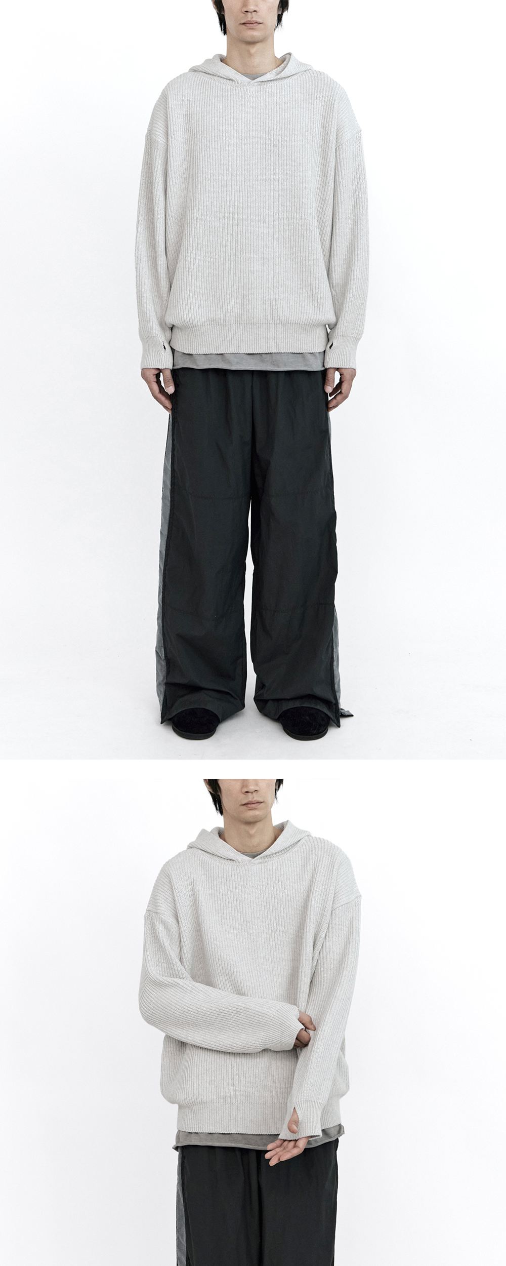 human knit hoodie - black, light gray - 벌키한 실루엣 - 루즈하게 떨어지는 핏감 - 크롭한 밸런스 - 소매 핑거홀 - 밑단 & 소매 립 *모델: 170 중반, 마른 체형 / 3사이즈 착용