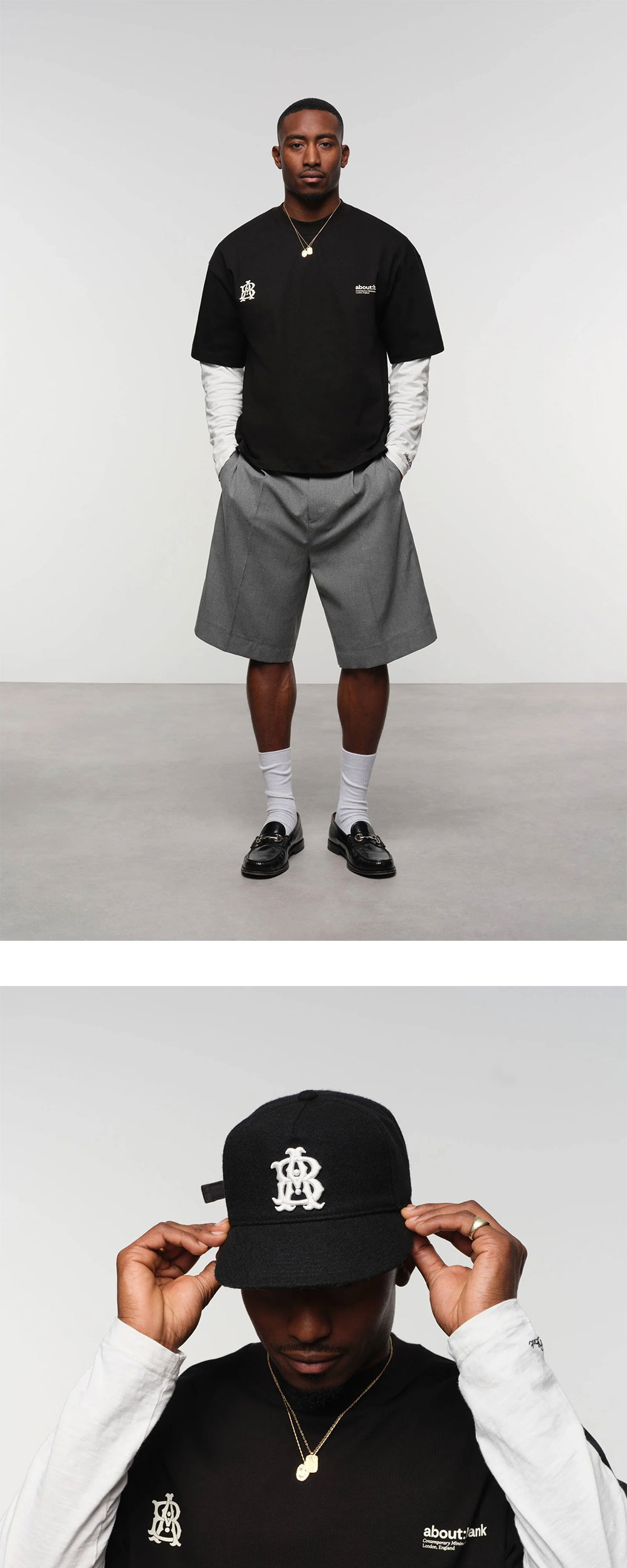 어바웃 블랭크 듀얼 로고 티셔츠 블랙 에크루입니다. - 340gsm 헤비웨이트 코튼 져지 소재 티셔츠 - 3.5cm 높이 모크넥 디자인 - 전면 좌우 로고 그래픽 포인트 - 후면 넥 하단 톤온톤 자수 디테일 - 드롭 숄더 - 크롭 기장의 박시 핏 - 측면 바깥 봉제선 없는 구조로 부드러운 실루엣