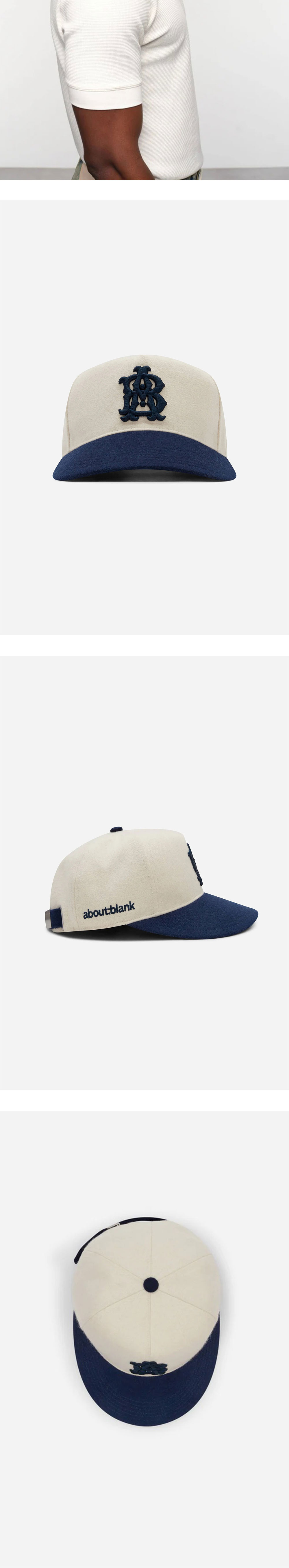 어바웃 블랭크 모노그램 콘트라스트 캡 에크루 네이비입니다. - 넓은 챙과 뾰족한 모자 형태 - 간편한 사이즈 조절을 위한 금속 잠금 장치 - 울 혼방 소재 - 3D 모노그램 자수