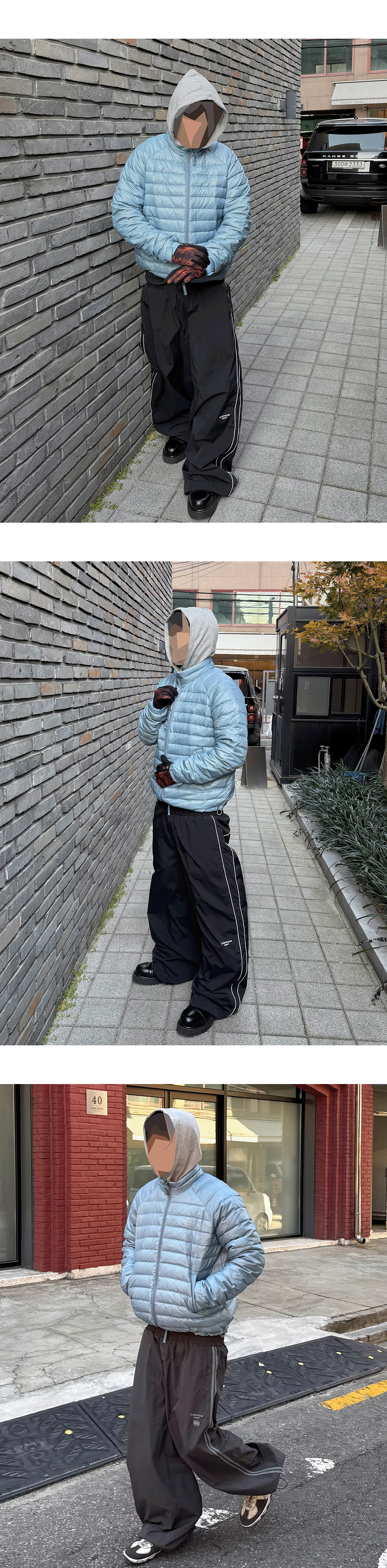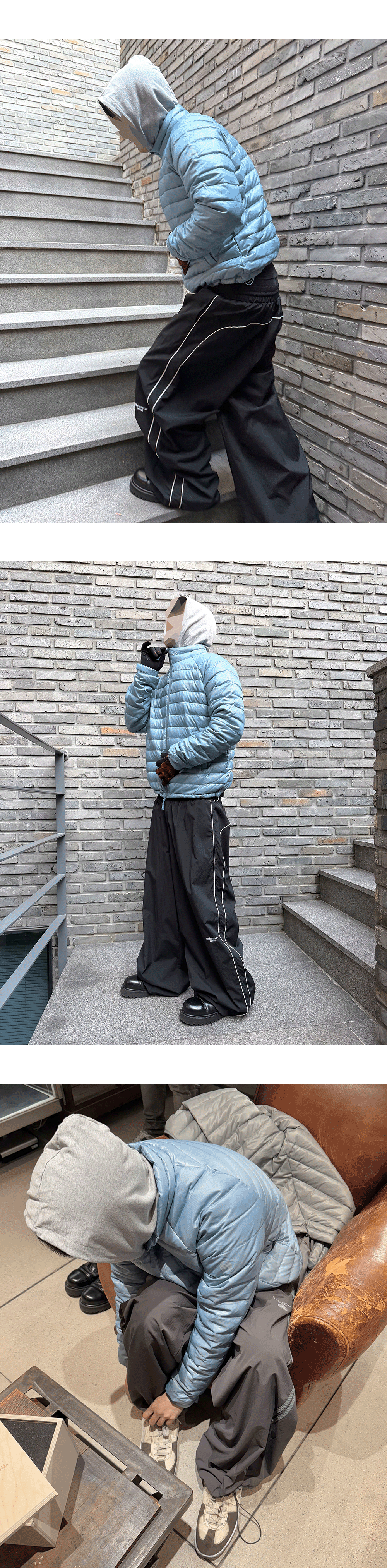 Model spec - 178cm / 70kg Outer : Undermycar Mu.150 Combi Basic Light Down Jacket Pastel Blue - Size 1 Top : Undermycar Mu.96 Anti Fxxking Logo Play Light Cropped Hoodie Melange Gray - Size 1 Pants : Undermycar Mu.126 Original Logo Piping Line Nylon Pants Black - Size 1 / Undermycar Mu.149 Combi Side Double Line Nylon Track- Ash Gray - Size 1 Acc : Undermycar x Umbro Stretch Gloves