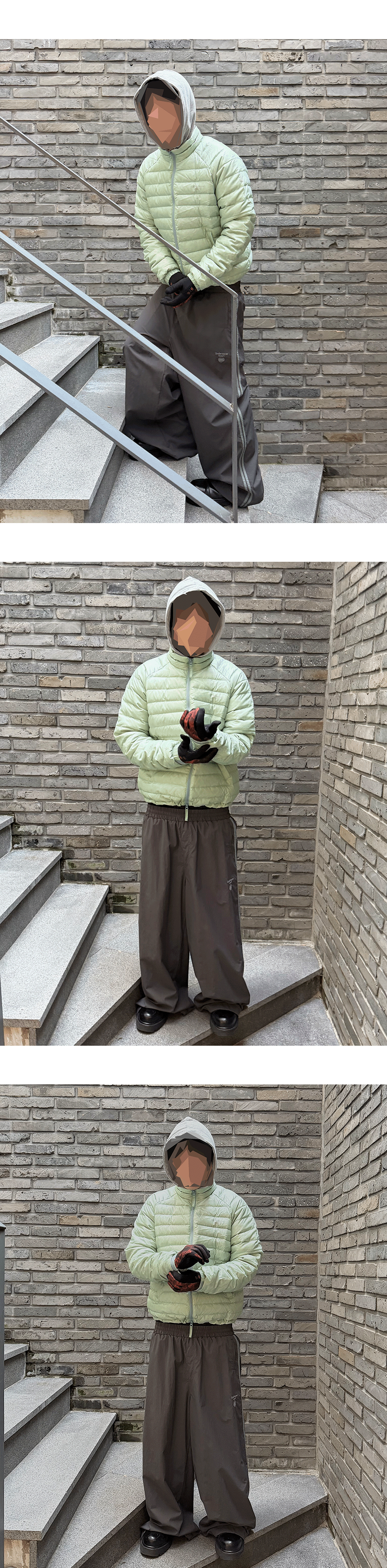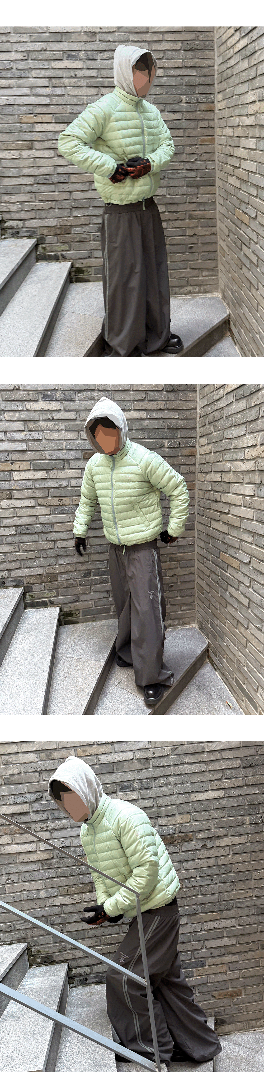 Model spec - 178cm / 70kg Outer : Undermycar Mu.150 Combi Basic Light Down Jacket Pastel Green - Size 1 Top : Undermycar Mu.96 Anti Fxxking Logo Play Light Cropped Hoodie Melange Gray - Size 1 Pants : MU.149 Combi Side Double Line Nylon Track Pants - Ash Gray - Size 1 Acc : Undermycar x Umbro Stretch Gloves