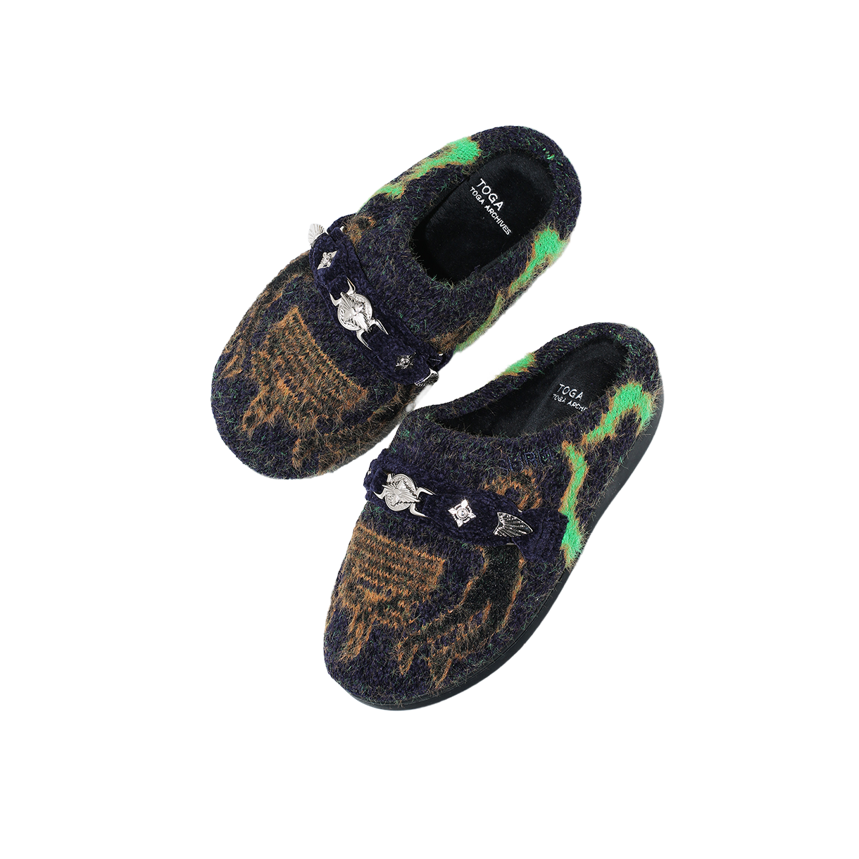 토가 x 스부 토가 투 니트 슬립온 네이비입니다. - TOGA와 SUBU의 첫 번째 협업 제품 - 추운 날씨에도 맨발로 신을 수 있는 겨울 샌들 - 부드러운 브러시 안감과 4중 구조의 인솔로 편안한 착화감 - TOGA의 상징적인 코인 메탈 밴드 장식 - 실내화 및 실외화로 모두 착용 가능