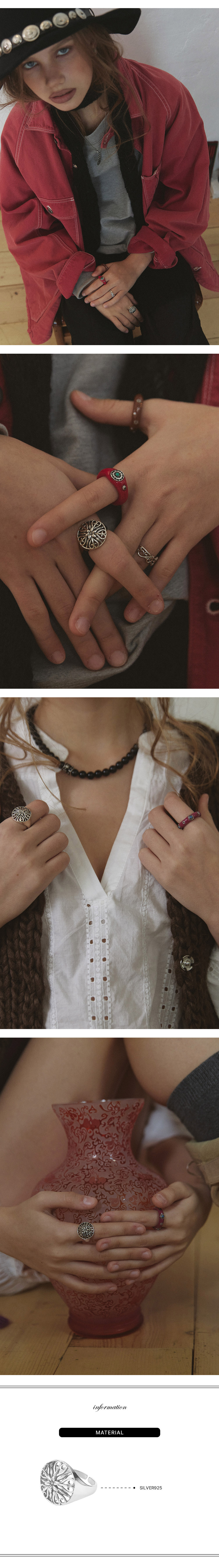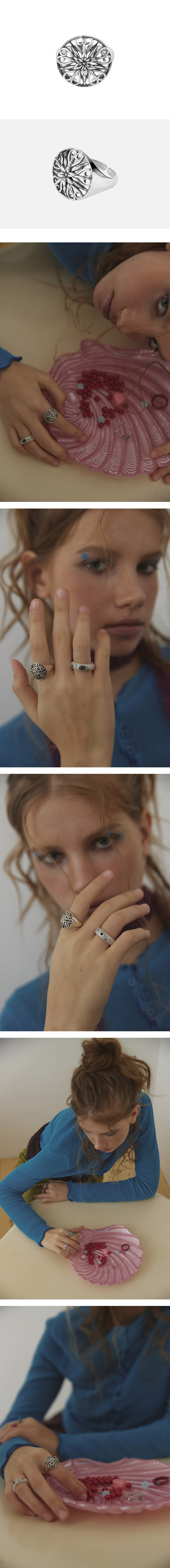 입체적인 플라워 패턴이 돋보이는 실버 반지입니다. 정교한 디테일과 볼륨감 있는 중앙 장식이 클래식하면서도 유니크한 무드를 연출합니다. 단독 착용은 물론, 다른 실버 링과의 레이어드로도 존재감을 더합니다. *주의사항 -착용할 때는 향수, 크림 및 다른 화학 물질과의 접촉은 피해주세요. 씻거나 로션을 바르기 전에는 반드시 제거해야 합니다. -착용하지 않을 때는 공기와의 접촉을 최소화할 수 있는 지퍼백이나 상자에 보관하는 것이 좋습니다. -세척 시 부드러운 천이나 전용 세척제로 부드럽게 닦아주세요. 너무 강하게 문지르면 유화 처리된 제품은 닳아 없어질 수 있으니 주의 바랍니다.