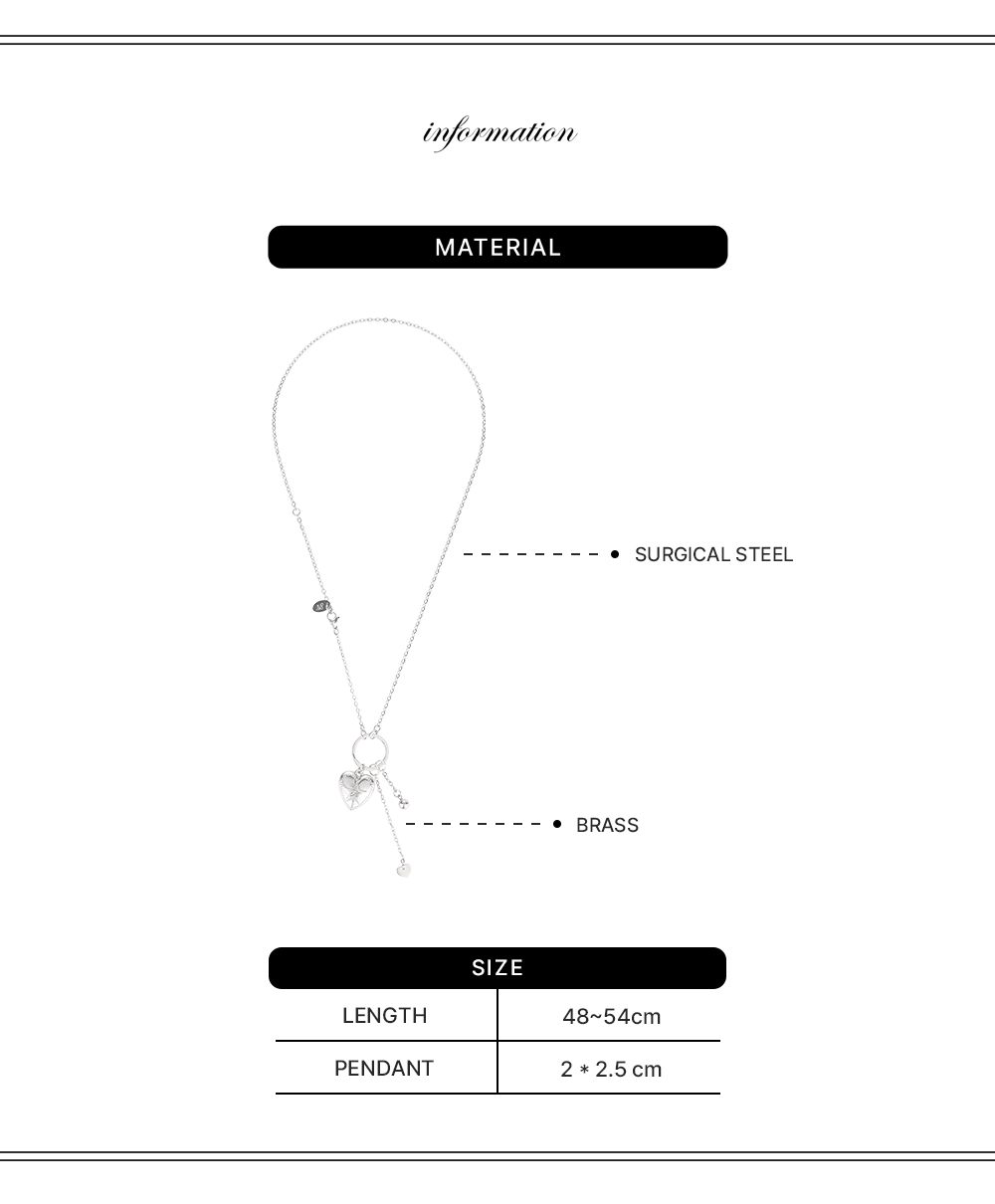 하트 펜던트와 드롭 체인이 자연스럽게 이어지는 실버 네크리스입니다. 움직일 때마다 흔들리는 드롭 체인 디테일이 포인트가 되어, 감각적인 스타일링을 완성합니다.