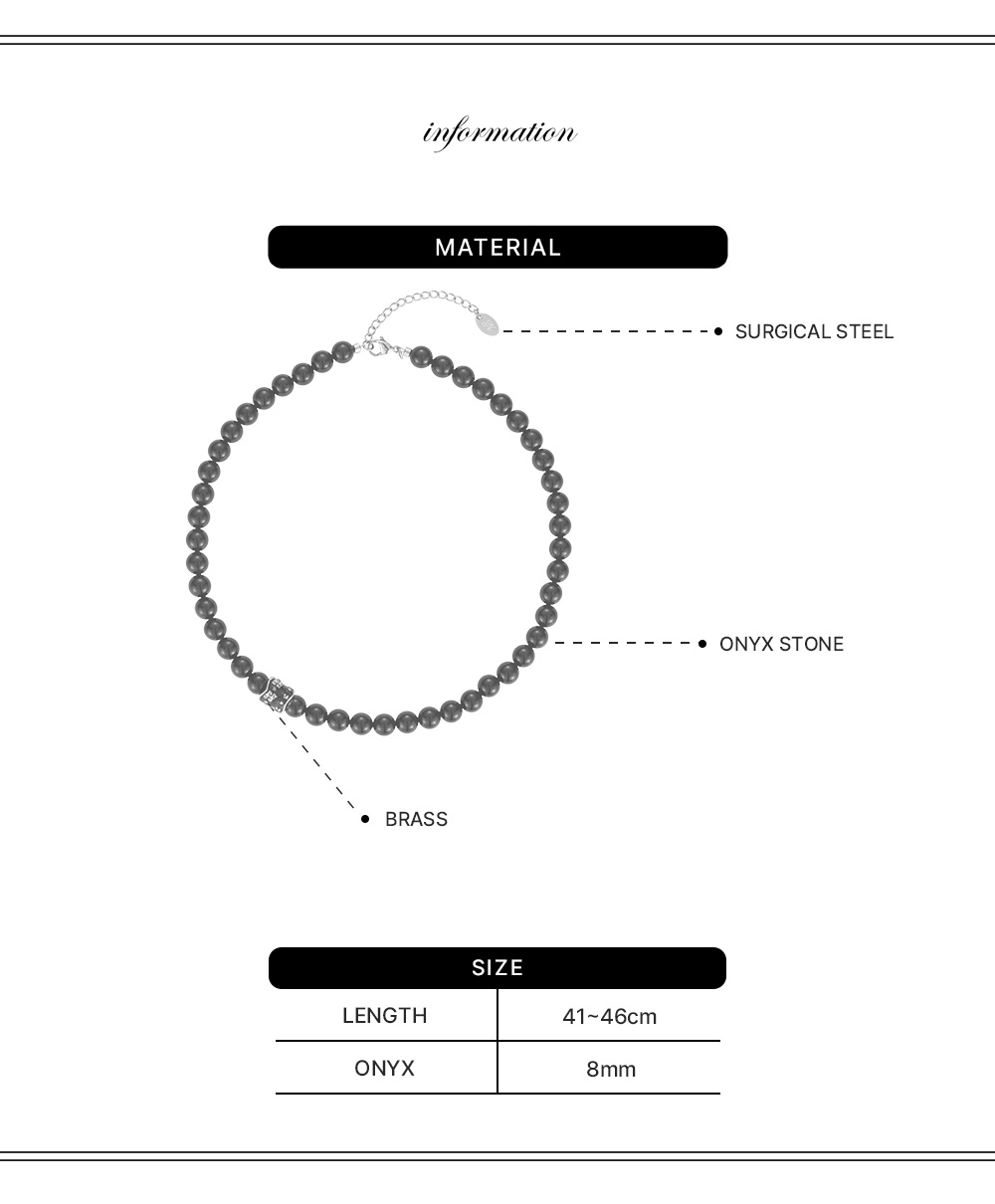 오닉스 스톤과 메탈 포인트 장식이 조화를 이루는 실버 네크리스입니다. 딥한 블랙 컬러가 고급스럽고 세련된 분위기를 연출하며, 심플한 디자인으로 데일리 아이템으로 활용하기 좋습니다.