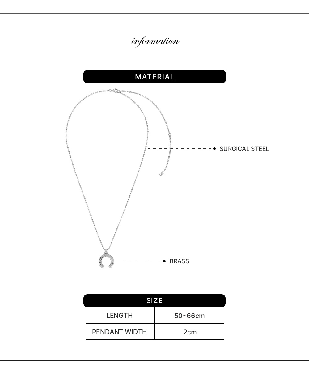 심플한 체인에 말굽 형태의 펜던트를 더한 목걸이입니다. 은은한 광택의 메탈 소재가 세련된 분위기를 연출하며, 행운을 상징하는 말굽 디자인으로 포인트를 주었습니다. 길이 조절이 가능한 체인으로, 빈티지한 무드를 표현 했습니다.