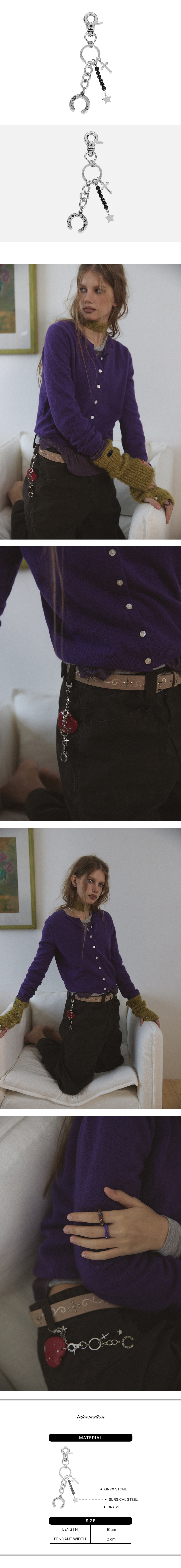 말발굽, 십자가, 별 펜던트가 조화를 이루는 실버 키링입니다. 블랙 비즈 장식이 포인트를 더해주며, 유니크하면서도 세련된 분위기를 연출합니다. 가방이나 키홀더에 스타일리시하게 매치하기 좋은 아이템입니다.