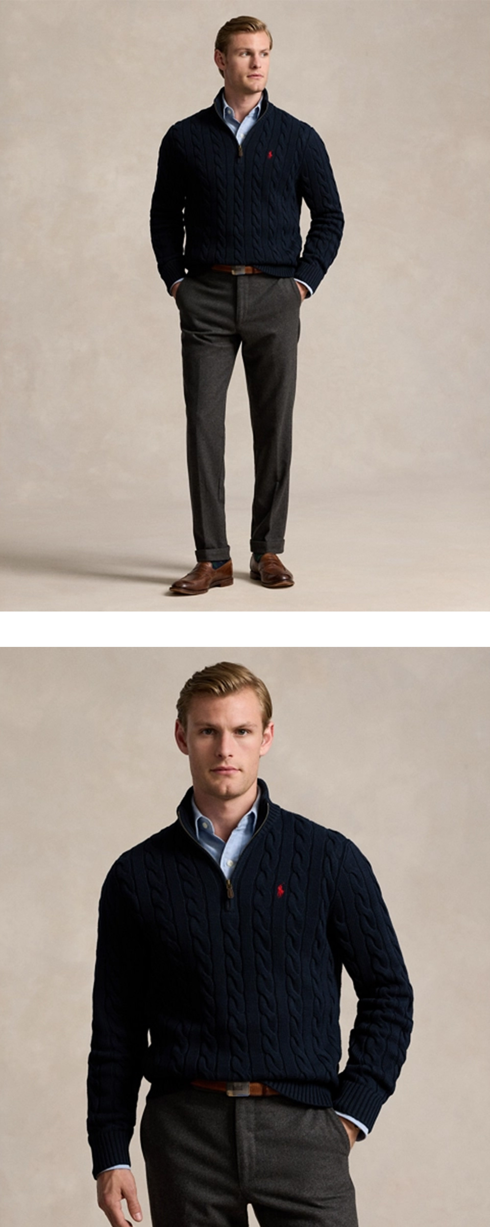 < KREAM은 랄프로렌 코리아 공식 파트너사로 모든 상품은 랄프로렌 코리아(유)에서 공급받은 정식 수입 제품입니다 > 폴로 랄프 로렌 케이블 니트 코튼 쿼터 지퍼 스웨터 헌터 네이비입니다. - 폴로 랄프 로렌의 가장 아이코닉한 디자인 - 지퍼 디테일로 활용도를 더한 니트 코튼 쿼터 지퍼 스웨터 - 레귤러핏 - 왼쪽 가슴에 포니 자수 - 리브 니트 모크넥, 밑단, 커프스 - 쿼터 지퍼 플래킷 - "폴로" 로고가 새겨진 맞춤 제작 스웨이드 지퍼 손잡이