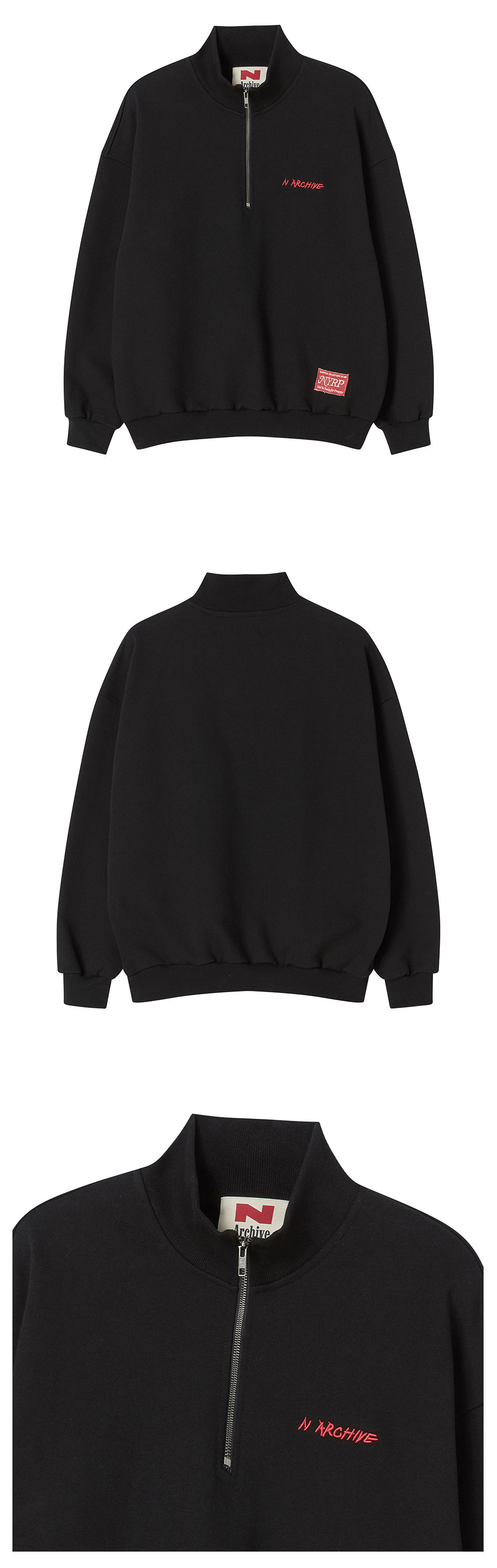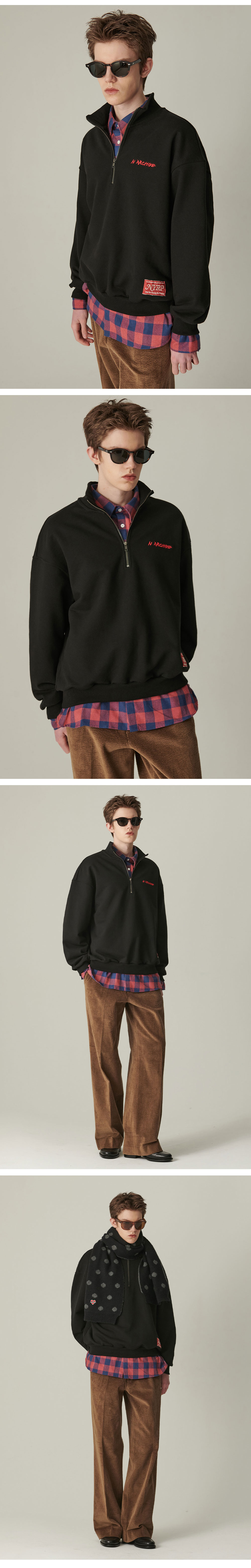ㆍ컬렉션 라인의 묵직한 중량이 매력적인 하프 집업 티셔츠 ㆍ헤비한 중량의 기모 원단을 사용 ㆍ덤블워싱&텐타 가공으로 세탁 후 변형 최소화 ㆍ세미오버 핏으로 자연스러운 실루엣 연출ㆍ간절기부터 겨울까지 활용도 높은 아이템 ㆍ고 퀄리티의 볼륨 디테일의 로고 자수와 핸드 메이드 제작의 라벨로 포인트 유니섹스 상품으로 제작 ㆍ여성분들은 M사이즈 착용 권장