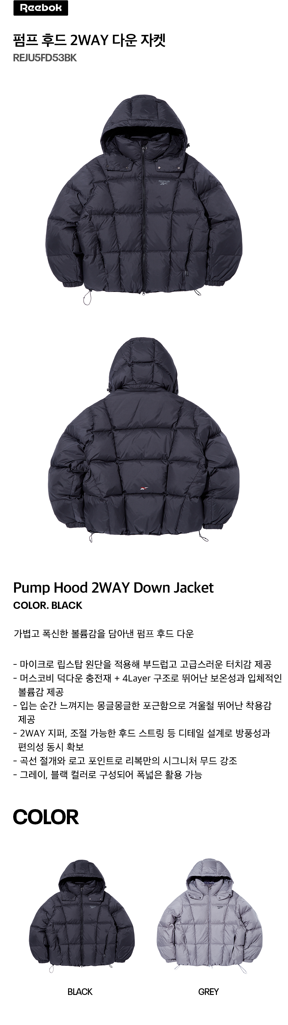 리복 펌프 후드 2WAY 다운 자켓 블랙