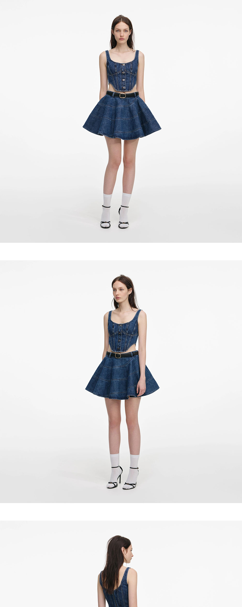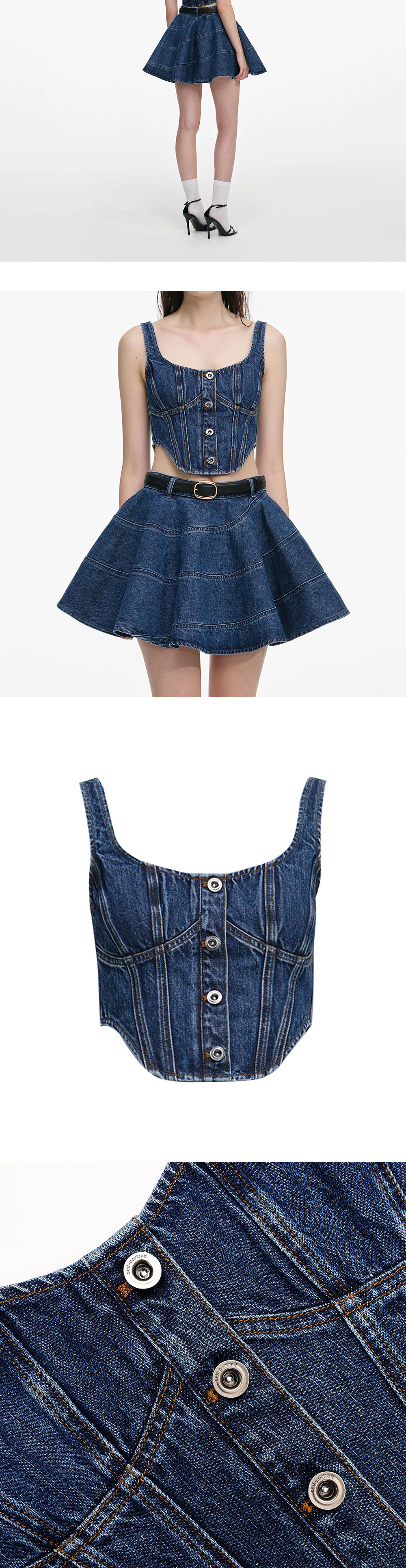셀프 포트레이트 우먼 데님 코르셋 탑 블루입니다. - 과감한 곡선 밑단 - 절개 라인 스티치 디테일 - 허리 라인을 잡아주는 코르셋 실루엣 - 메탈 버튼 여밈