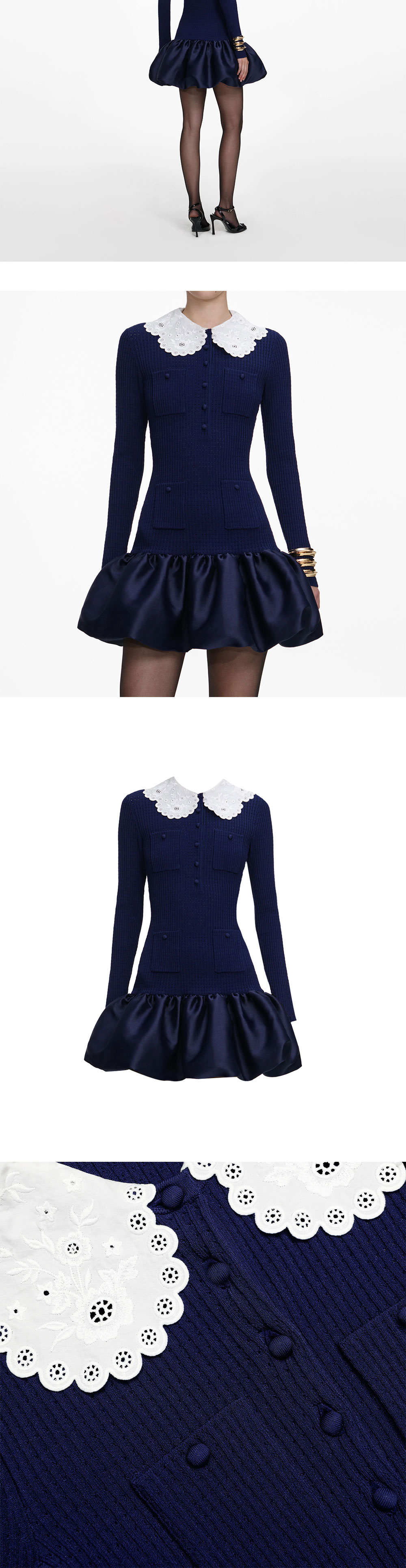 셀프 포트레이트 우먼 니트 태피터 미니 드레스 네이비입니다. - 포인텔 니트의 부드러운 편안함 - 테피터의 은은한 광택 - 스타일리시한 버블 밑단 - 브로데리 앙글레즈 칼라