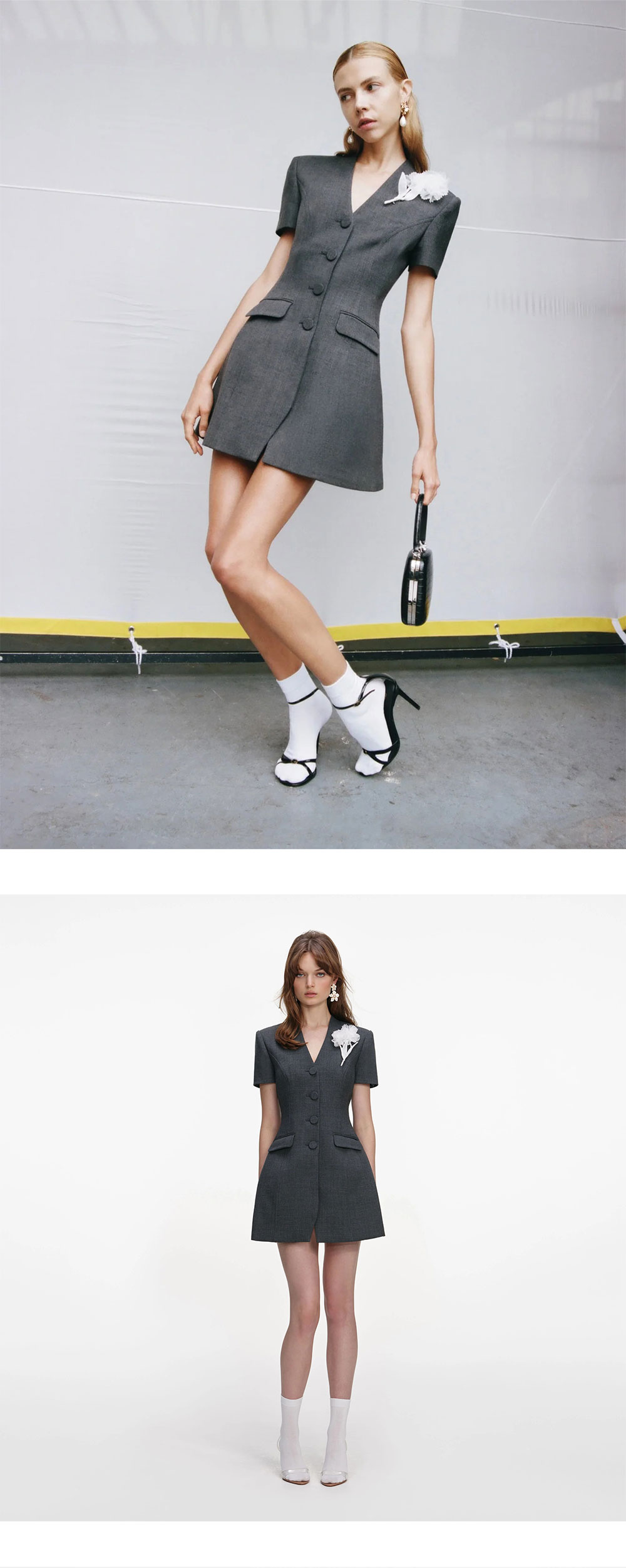 셀프 포트레이트 우먼 테일러드 플라워 디테일 미니 드레스 그레이입니다. - 클래식한 테일러링 - A라인 실루엣 미니 드레스 - 탈부착 가능한 꽃 브로치 - 어깨 패드와 캡소매 - 노카라 V넥 라인 - 플랩 포켓과 클로저 버튼