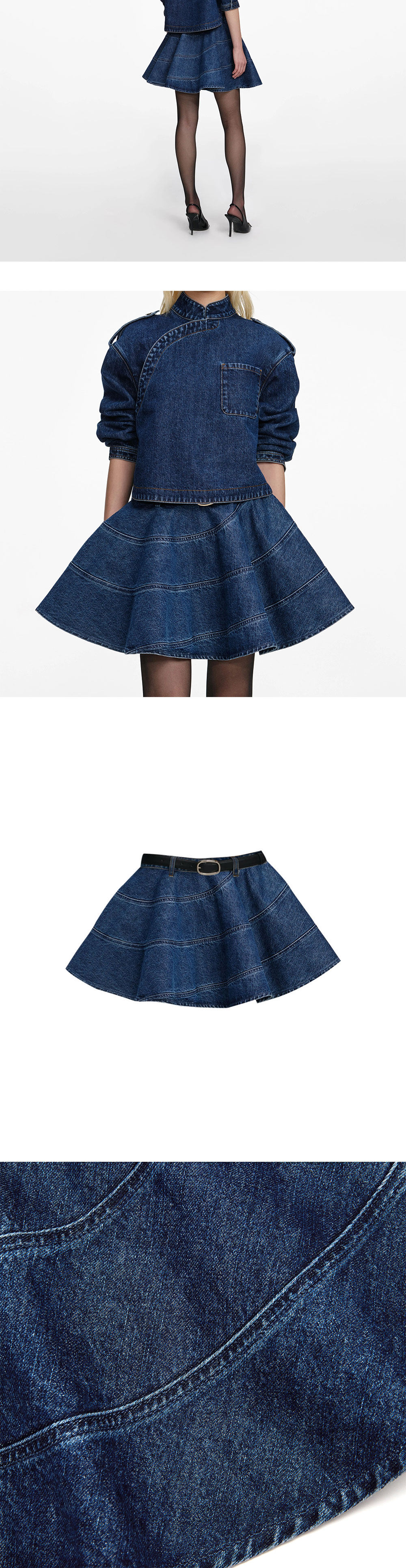 셀프 포트레이트 우먼 플레어 데님 미니 스커트 블루입니다. - 나선형의 콘트라스트 스티칭 - 볼륨감 있는 플레어 실루엣 - 탈착식 벨트
