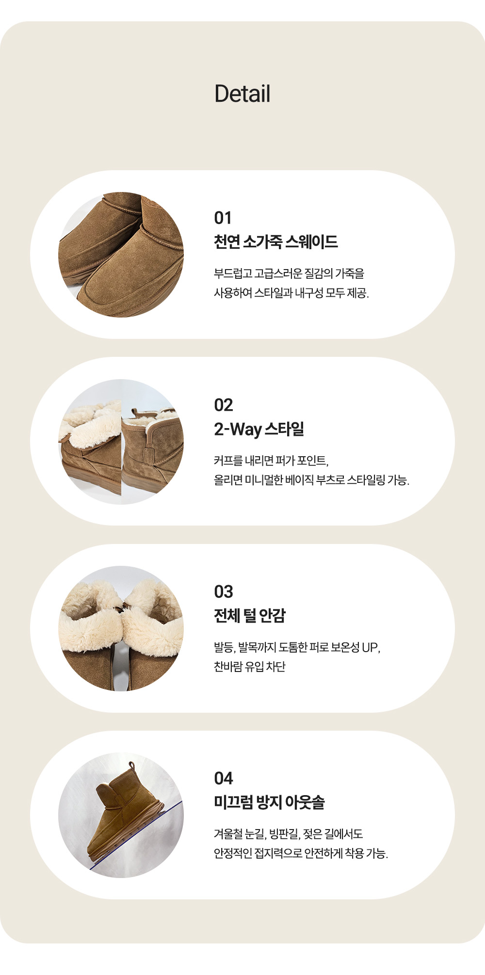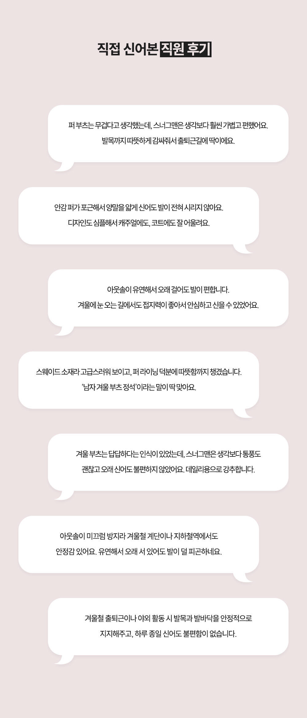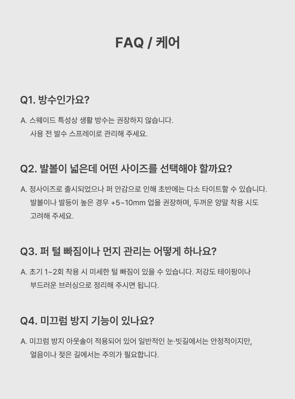 8.신발 뒷꿈치를 꺽어 신지 마십시오.기름기가 있는 곳은 피하고, 화기주의에 놓으면 변형이 발생할 수 있으니 주의해주세요.,9.물기가 있는곳, 빗길, 빙판길, 눈길에서의 보행시 미끄러져 다칠 우려가 있으니 주의 해주세요.