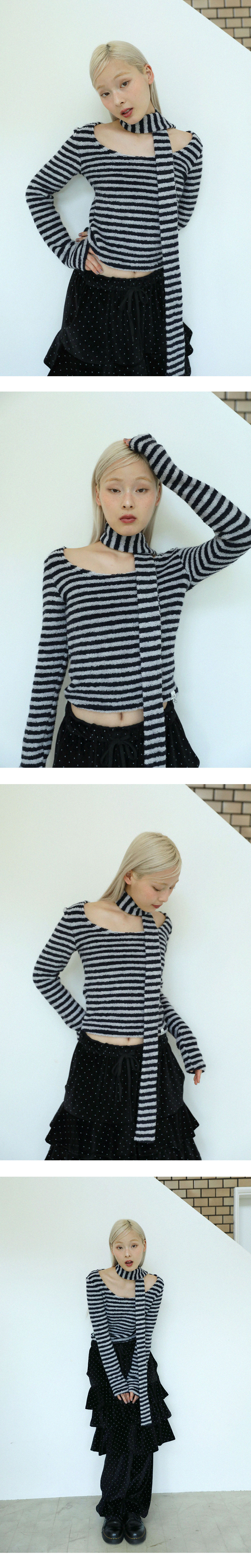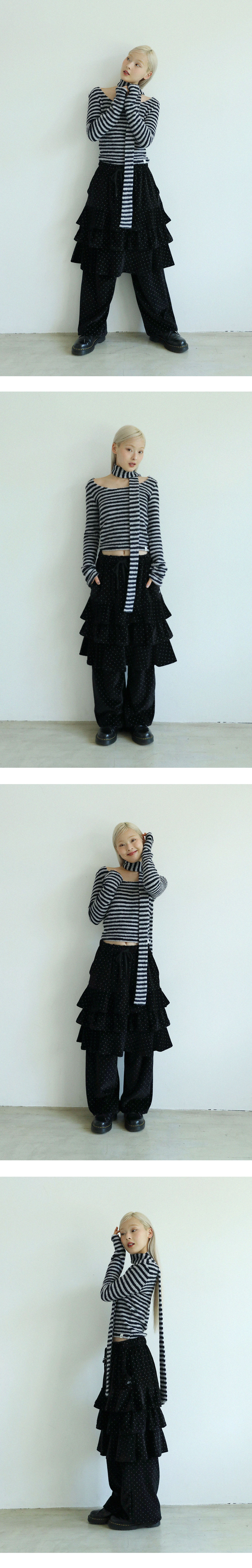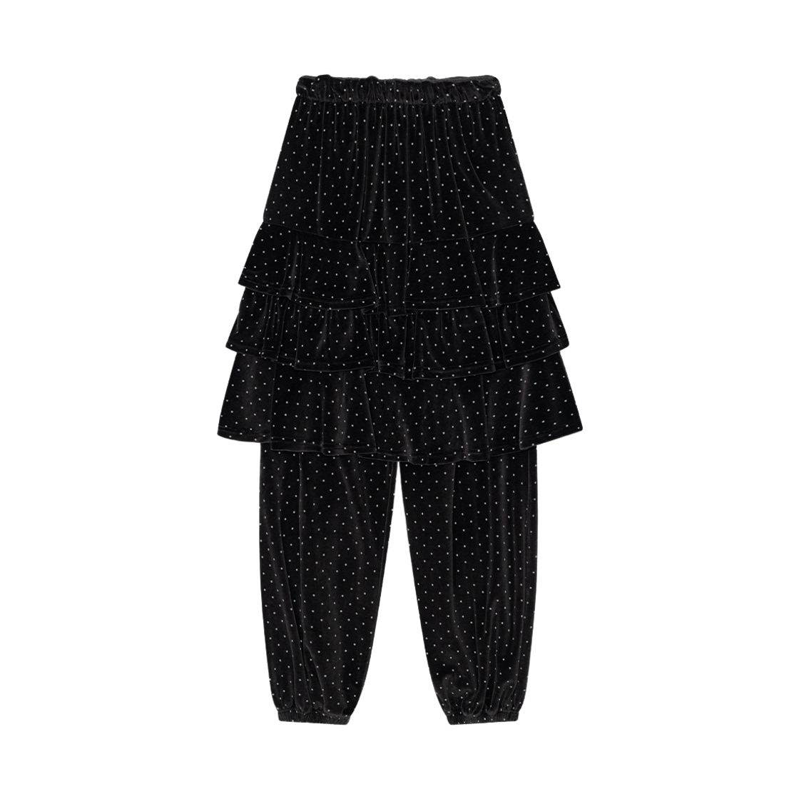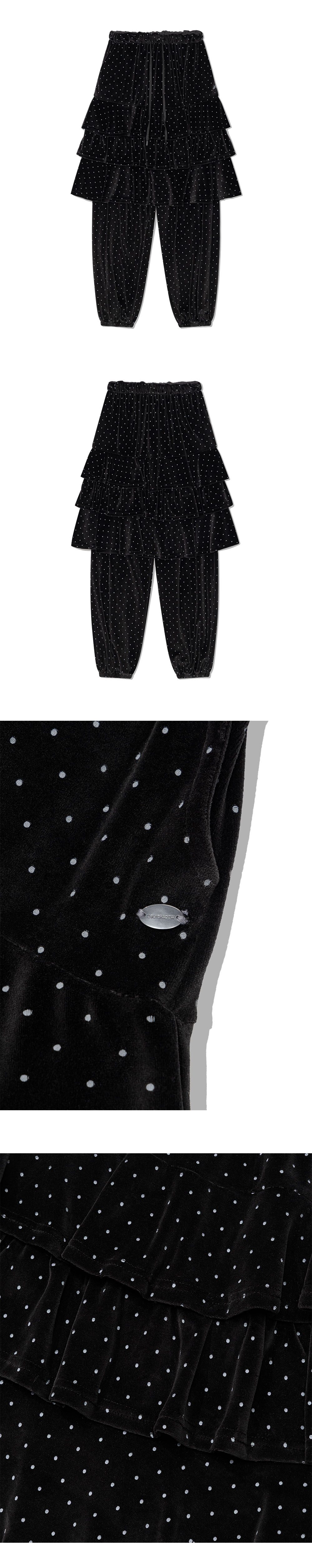 도트 벨벳 원단의 3단 캉캉으로 이루어진 스커트 팬츠입니다.
