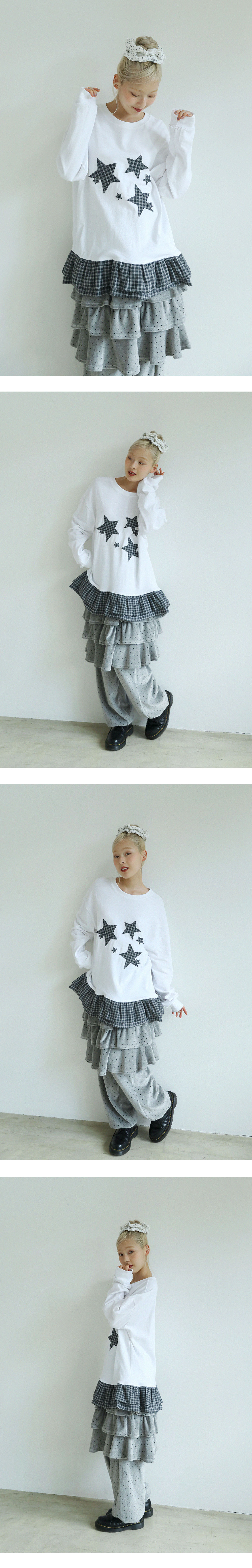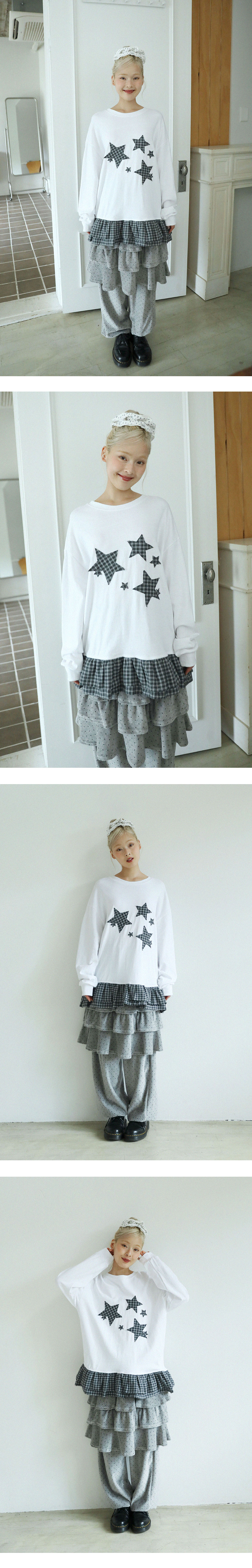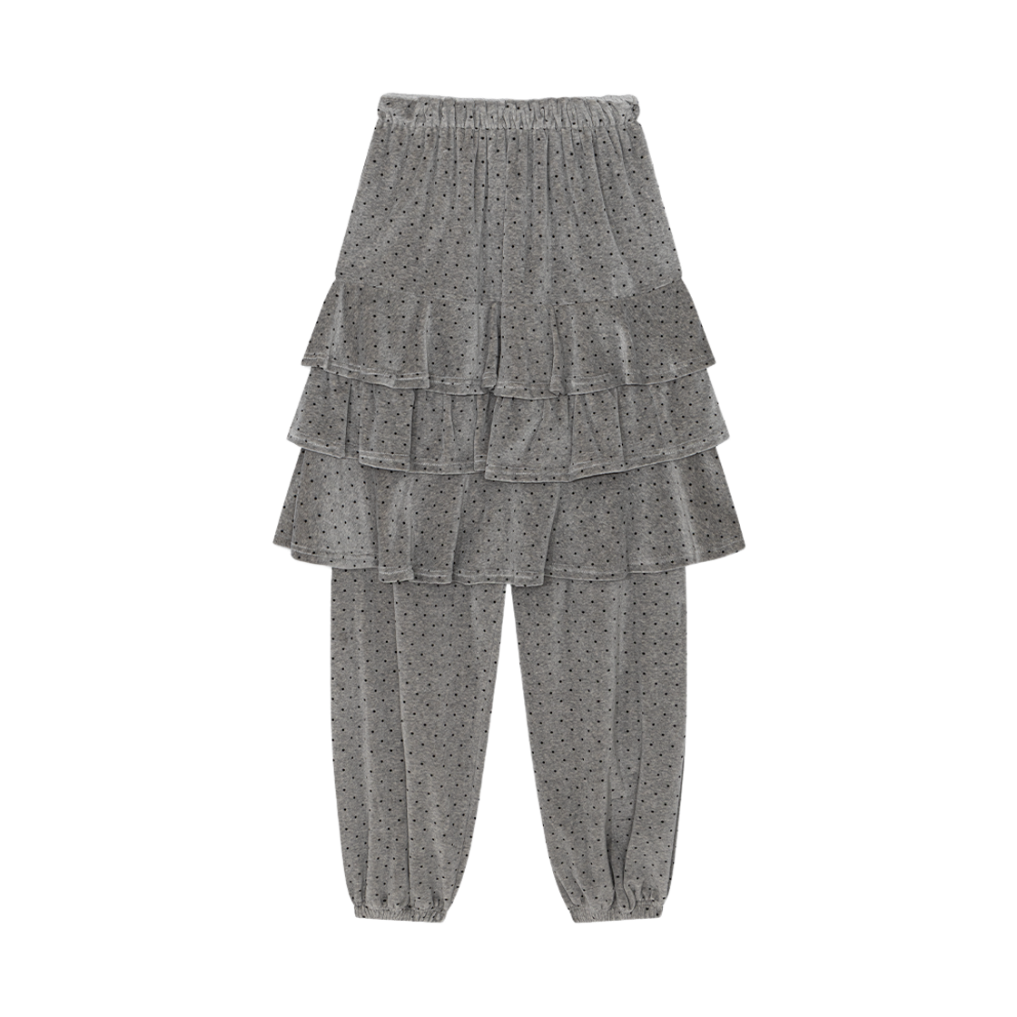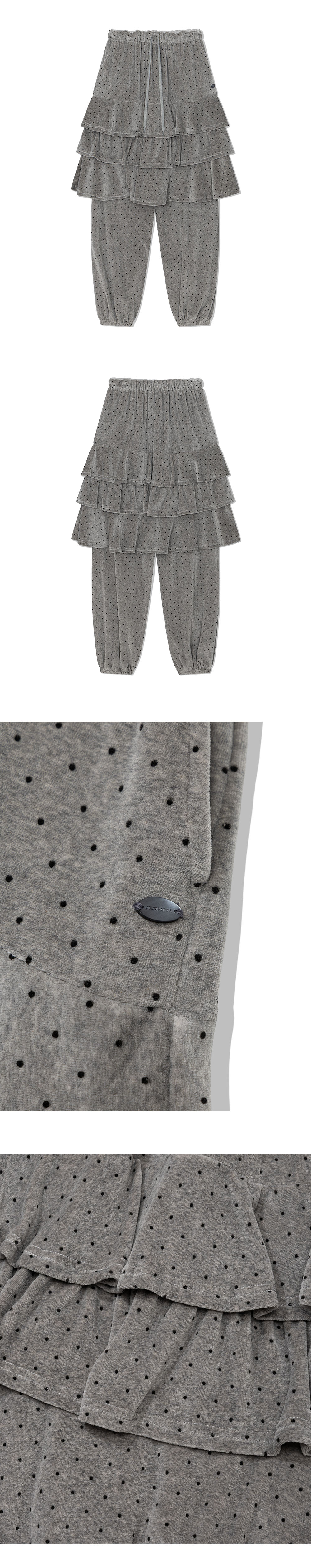 도트 벨벳 원단의 3단 캉캉으로 이루어진 스커트 팬츠입니다.