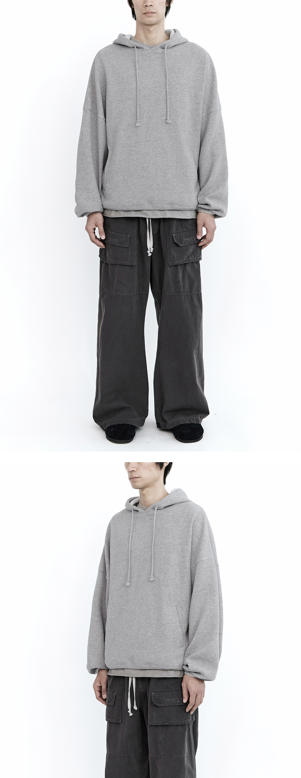 human volume hoodie - 포근한 착용감 - 후드 배색 안감 - 드롭 숄더 - 크롭한 밸런스 - 소매 배색 테이핑 - 투포켓 - 밑단 스트링 *모델: 170 중반 / 마른 체형, 3사이즈 착용