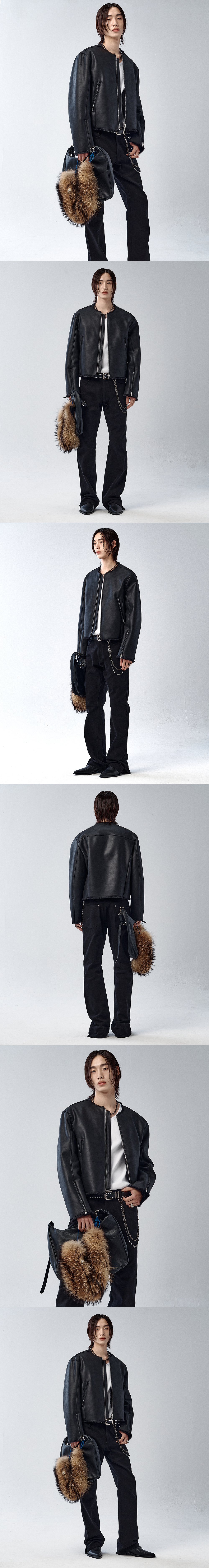 페이크 무스탕 소재로 제작된 카라리스 크롭 재킷입니다. 매트한 텍스처의 페이크 레더 외피와 부드러운 페이크 퍼 안감이 대비되는 질감을 형성합니다. 넥라인, 밑단, 소맷단은 컷오프 마감으로 처리해 자연스러운 텍스처를 강조하며, 레귤러한 핏의 크롭 실루엣으로 구조적인 밸런스를 완성했습니다. -DETAIL- 레귤러 핏 크롭 실루엣 매트한 텍스처의 인조가죽 페이크 퍼 안감 넥·밑단·소맷단 컷오프 마감 프런트 투웨이 지퍼 여밈 지퍼 포켓 소매 지퍼 디테일