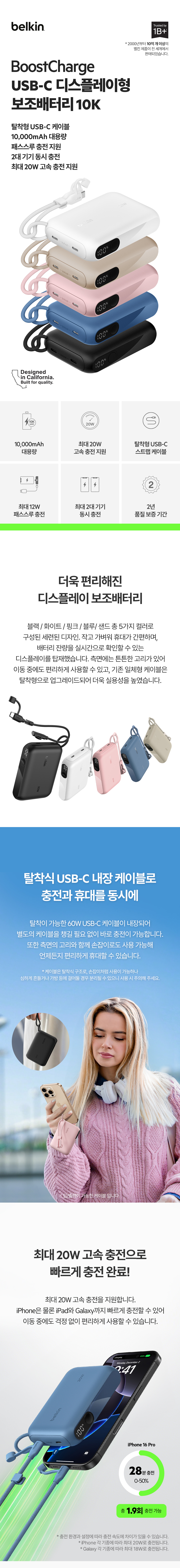벨킨 20W 10000mAh 디스플레이 고속 충전 보조배터리 BPB027 핑크