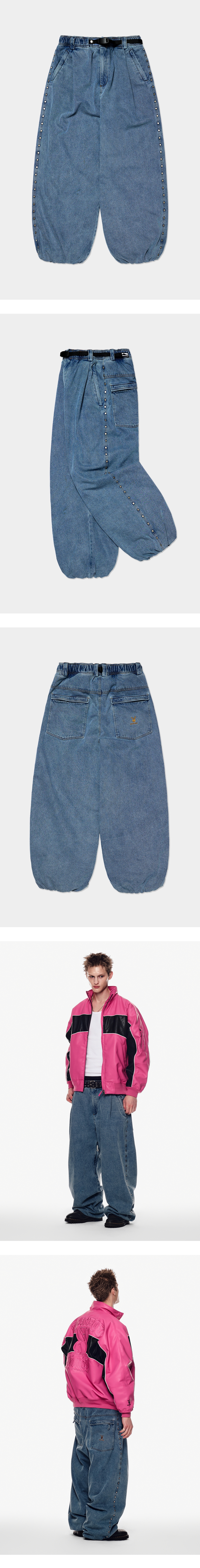 [디미토 X 플레이보이] 스터드 라인 오지 데님 팬츠 와이드 핏 레벨 2 워시드 블루