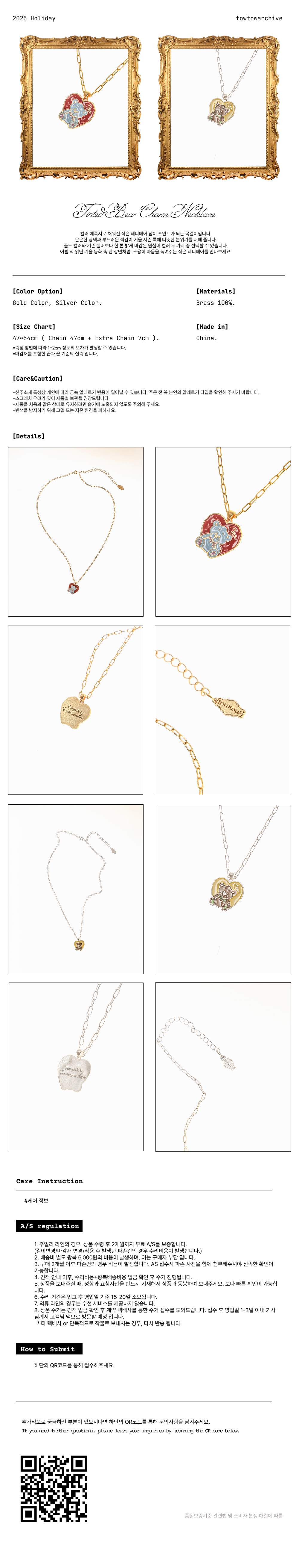 컬러 에폭시로 채워진 작은 테디베어 참이 포인트가 되는 목걸이입니다. 은은한 광택과 부드러운 색감이 겨울 시즌 룩에 따뜻한 분위기를 더해 줍니다. 골드 컬러와 기존 실버보다 한 톤 밝게 마감된 원실버 컬러 두 가지 중 선택할 수 있습니다. 어릴 적 읽던 겨울 동화 속 한 장면처럼, 조용히 마음을 녹여주는 작은 테디베어를 만나보세요.