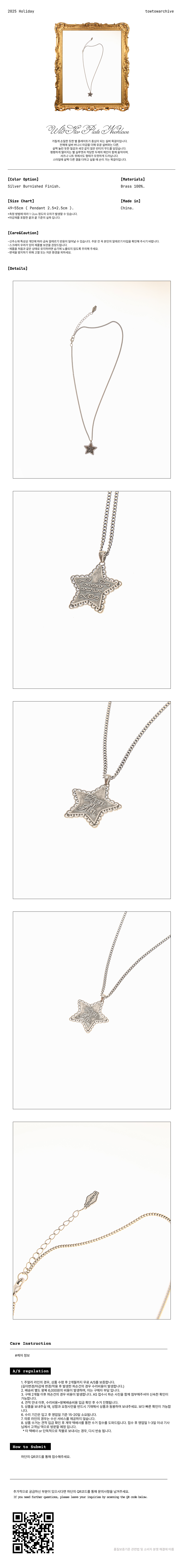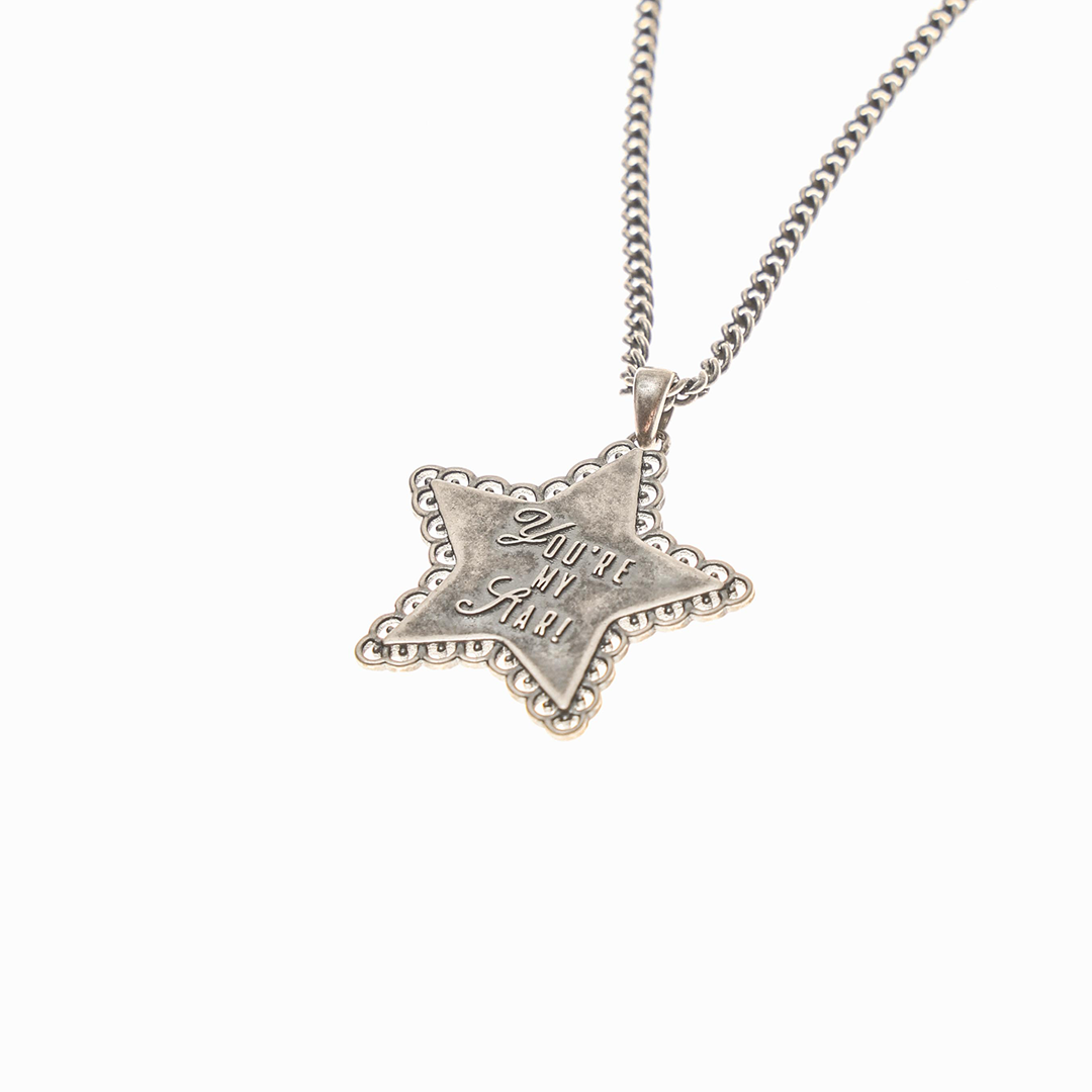 거칠게 손질한 듯한 별 플레이트가 중심이 되는 실버 목걸이입니다. 전체에 실버 버니시 마감을 더해 유광 실버와는 다른, 살짝 눌린 듯한 질감과 새것 같지 않은 빈티지 무드를 담았습니다. 평평하게 떨어지는 별 실루엣과 적당한 두께의 체인이 함께 움직이며. 셔츠나 니트 위에서도 형태가 또렷하게 드러납니다. 스타일에 살짝 다른 결을 더하고 싶을 때 손이 가는 목걸이입니다.