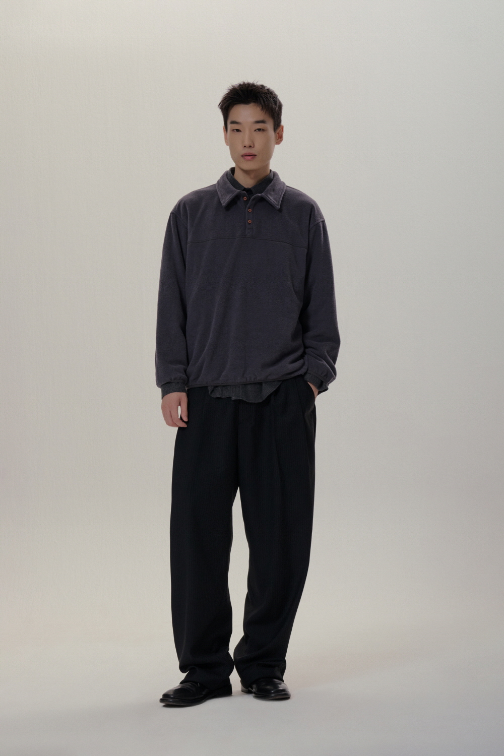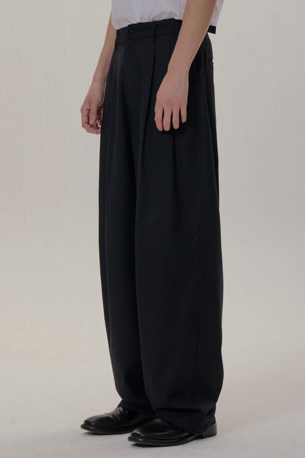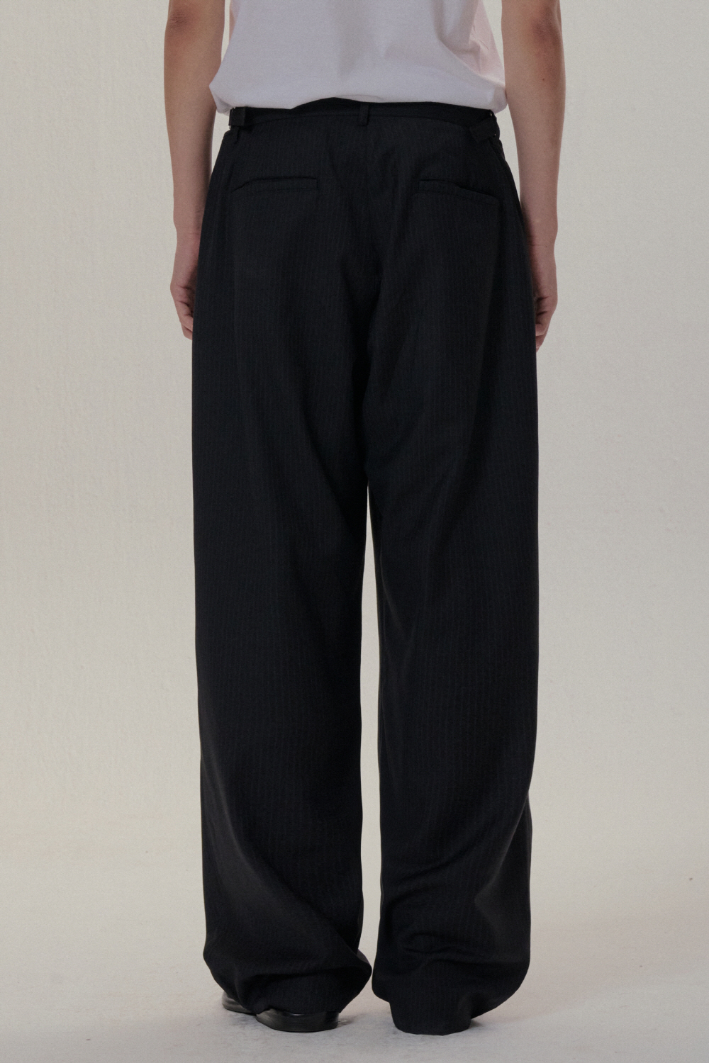 - 와이드하고 풍성한 실루엣의 트라우져스 입니다. - 찰랑거리는 느낌의 스트라이프 울 혼방 원단을 사용하였습니다. - 허리부분에 있는 어드저스터를 통해 사이즈를 줄여서 착용이 가능합니다. - 2개에 플리츠가 있어 허벅지와 전체적인 실루엣을 풍성하게 잡아줍니다. - 무릎위까지 오는 기장감의 안감을 부착하여, 보다 착용감이 부드럽습니다. - 수선이 용이하도록 밑단 시접을 4CM 정도 여유있게 주었습니다.