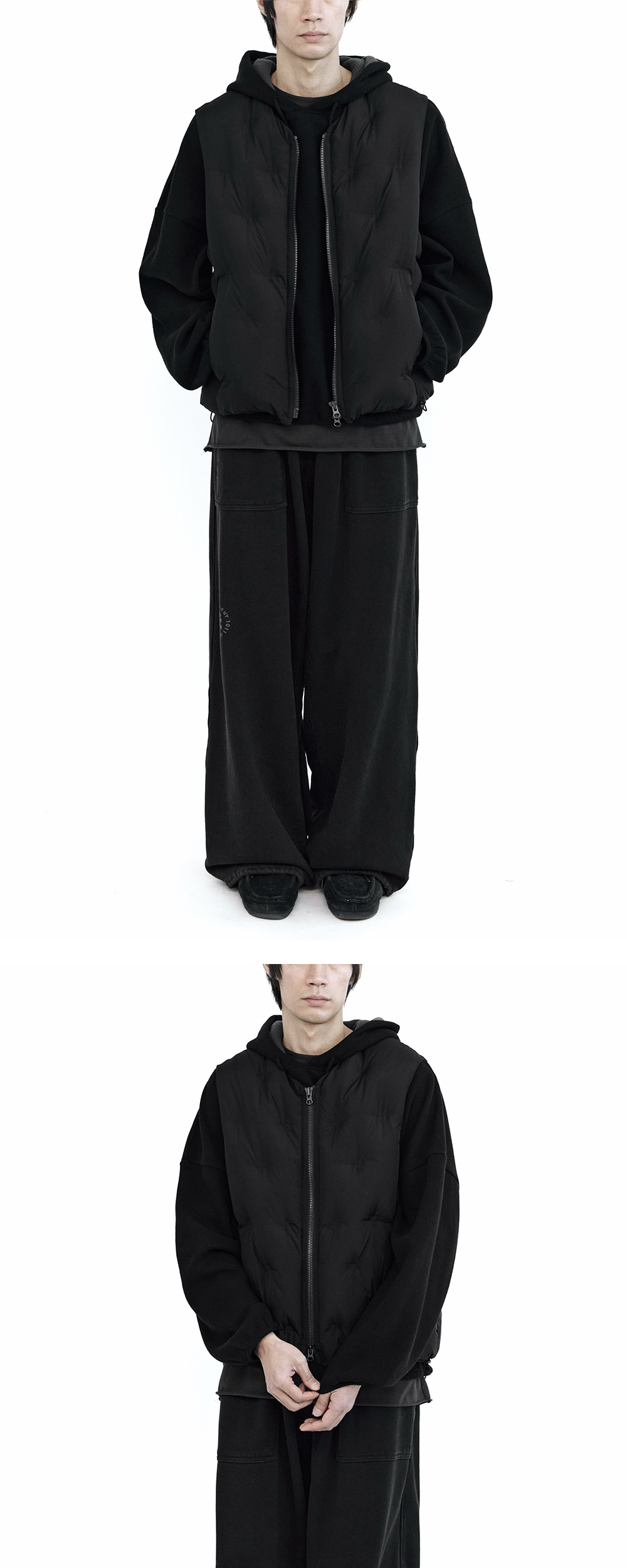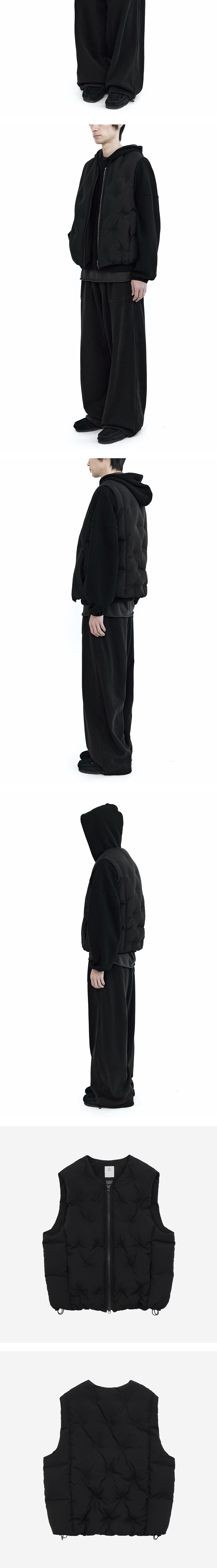 embo down vest - black, beige - 십자 형태의 엠보싱 적용 - 사이드 패널 디테일 - 레더 풀러 적용된 사이드 지퍼 포켓 - 2개의 내부 포켓 - YKK 비슬론 투웨이 지퍼 클로징 - 밑단 스트링 & 고정용 비즈 *모델: 170 중반, 마른 체형 / 3사이즈 착용