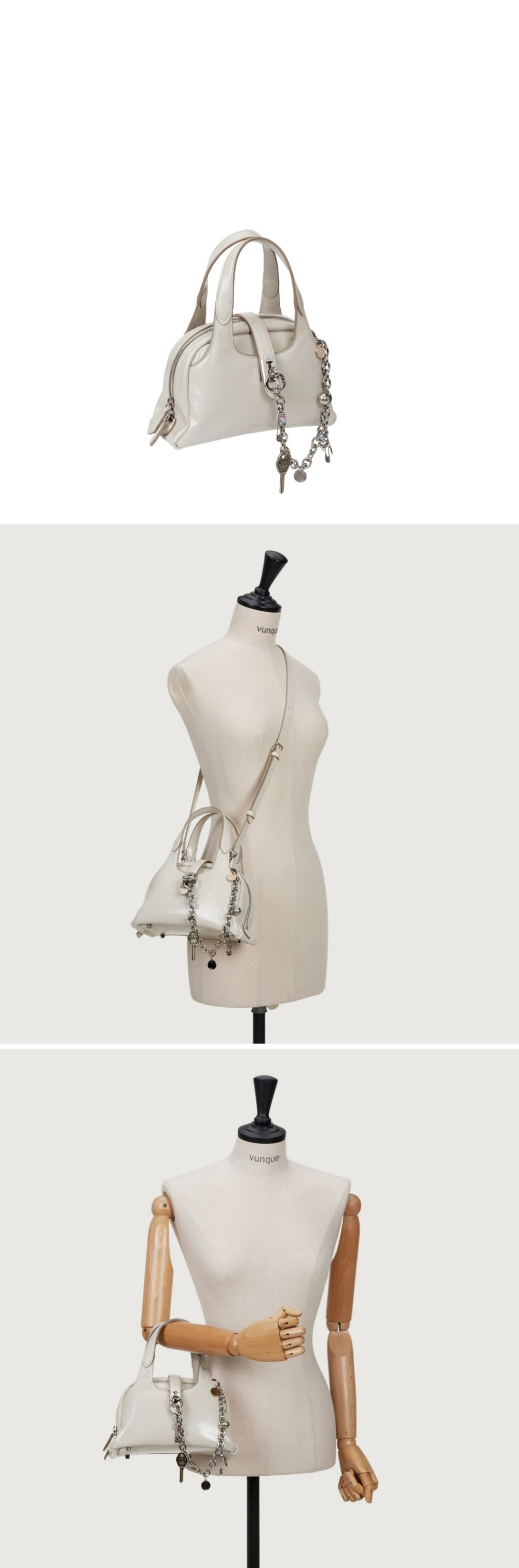 볼드한 체인에 열쇠 장식을 포함한 다양한 오브제들이 연결된 체인양옆 오링 개고리가 있어 가방 핸들 및 면도칼 링 장식에 걸어서 사용 ">