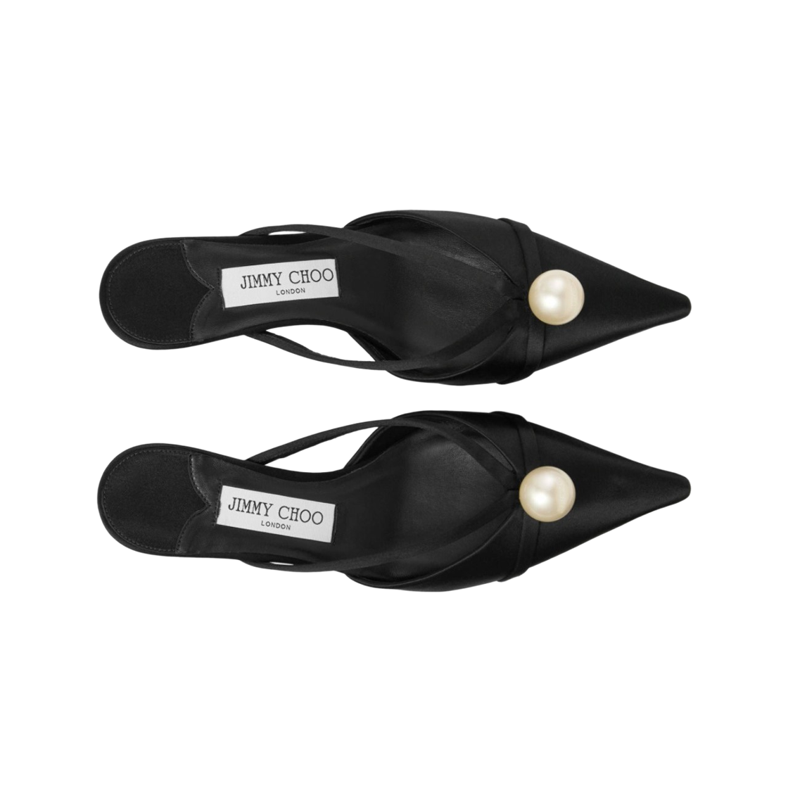 (W) 지미추 사나 50 펄 데코레이티드 디테일 사틴 뮬 블랙 화이트