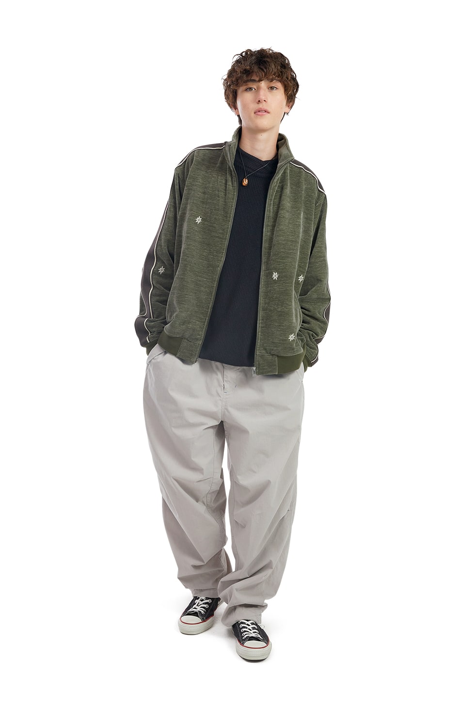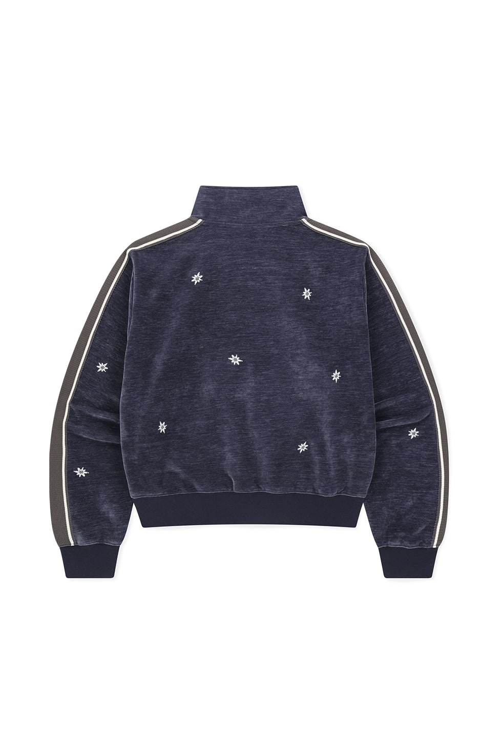 · 벨루아 트랙 자켓 · 기능성 폴리에스터 혼방 원단 사용 · 보온성, 신축성 우수 · 메쉬 포켓감 사용 · 몸판 밑단, 소맷단 밴딩 처리 · 몸판 자수와 소매 테이프 디테일 · 전면,포켓에 YKK 지퍼 사용 97% Polyester 3% Span Made in China Male - Large/180cm Female - Small/165cm
