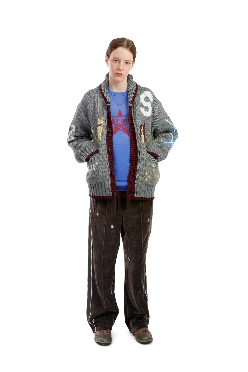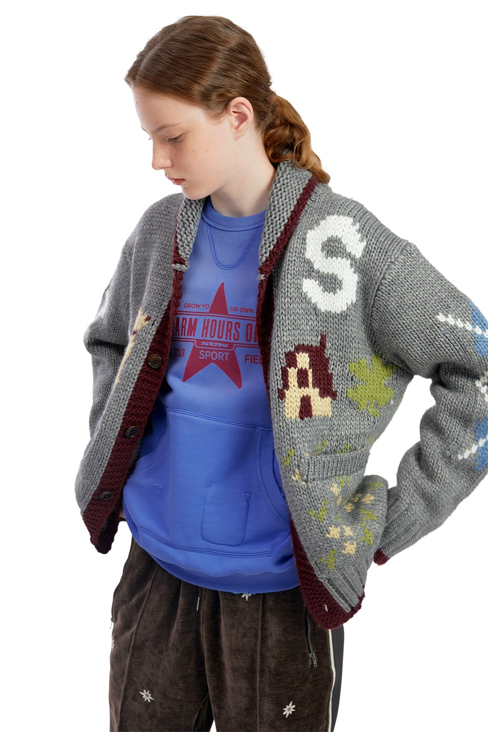 · 코위찬 가디건 · 아크릴, 울 혼방 원사 사용 · 부드러운 터치감, 보온성 우수 · 수납이 가능한 포켓 · 시즌 그래픽 자카드 디테일 80% Acrylic 20% Wool Made in Vietnam Male - Large/180cm Female - Small/173cm
